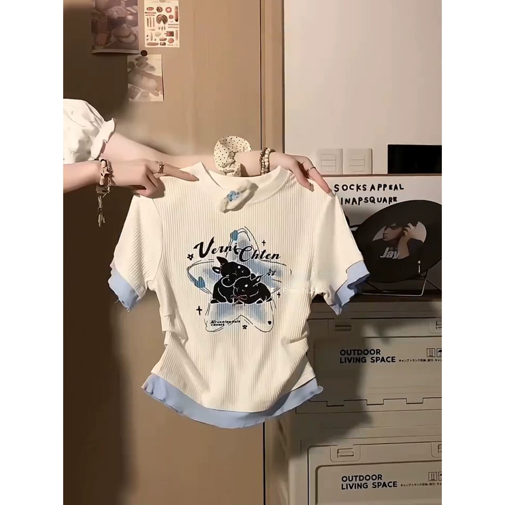 Fresh milk blue hottie striped short-sleeved chic fake two-piece