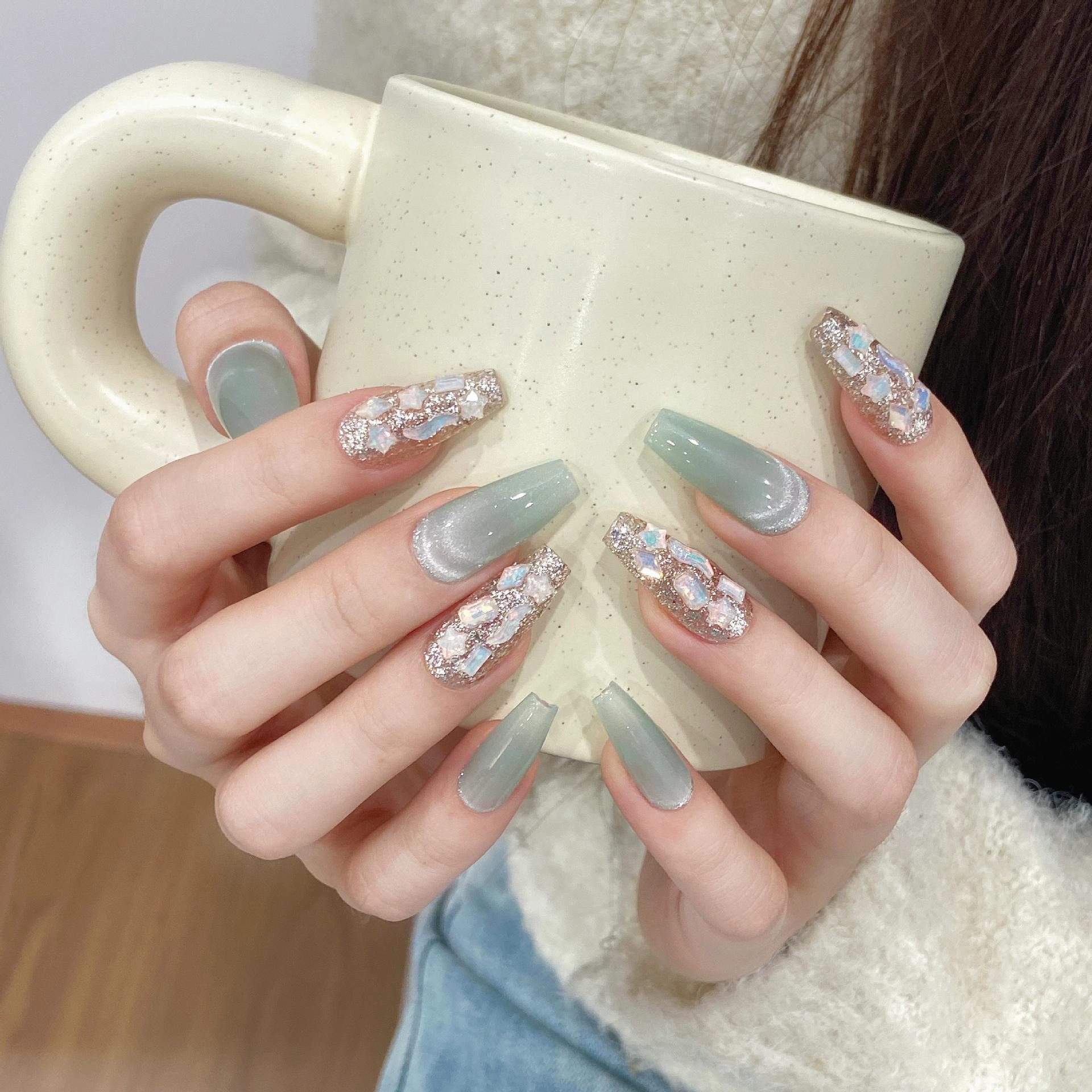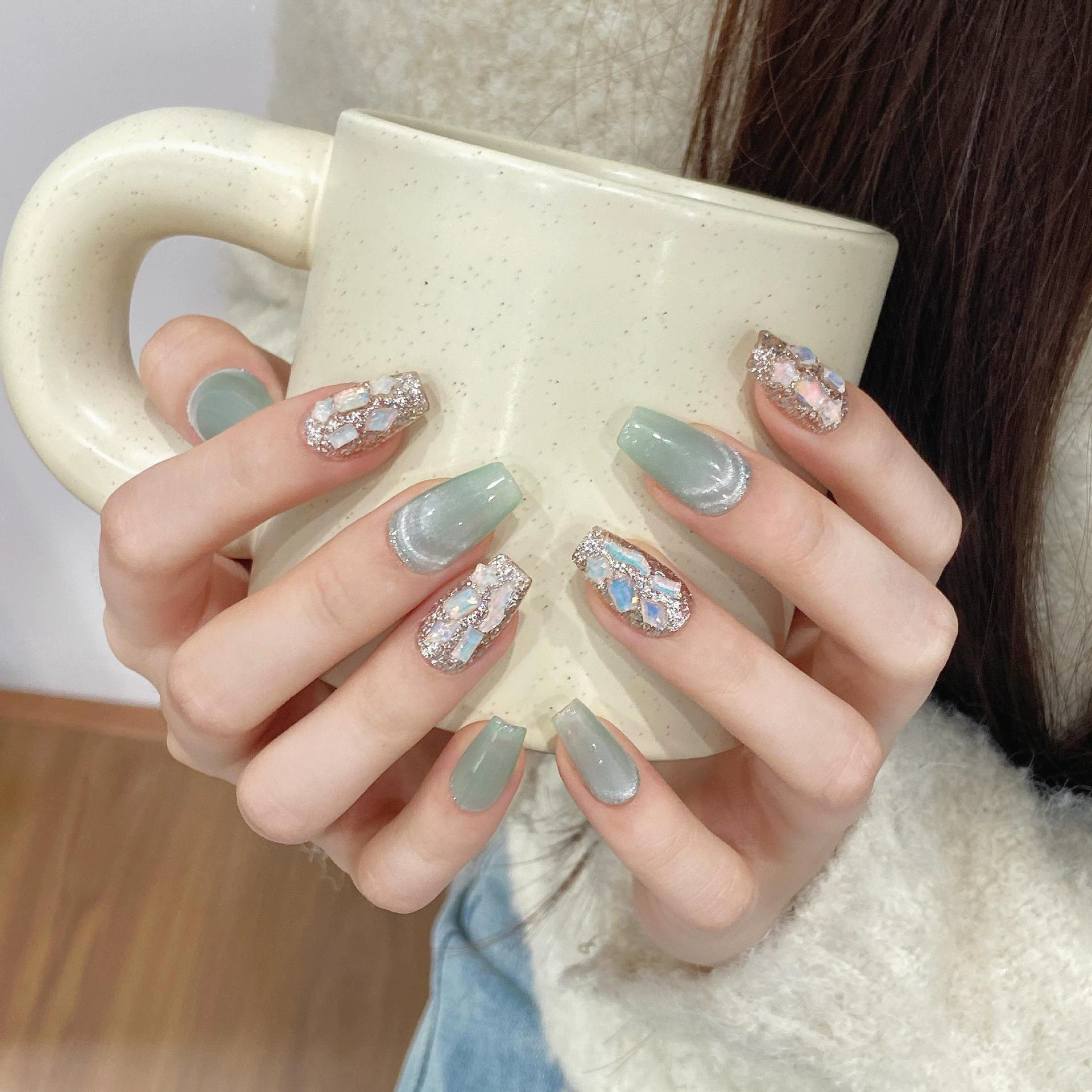 | nameOriginal | Fresh mint light green summer manicure pure handmade wearable manicure pure desire cat eye blue wave whitening simple with diamonds  |