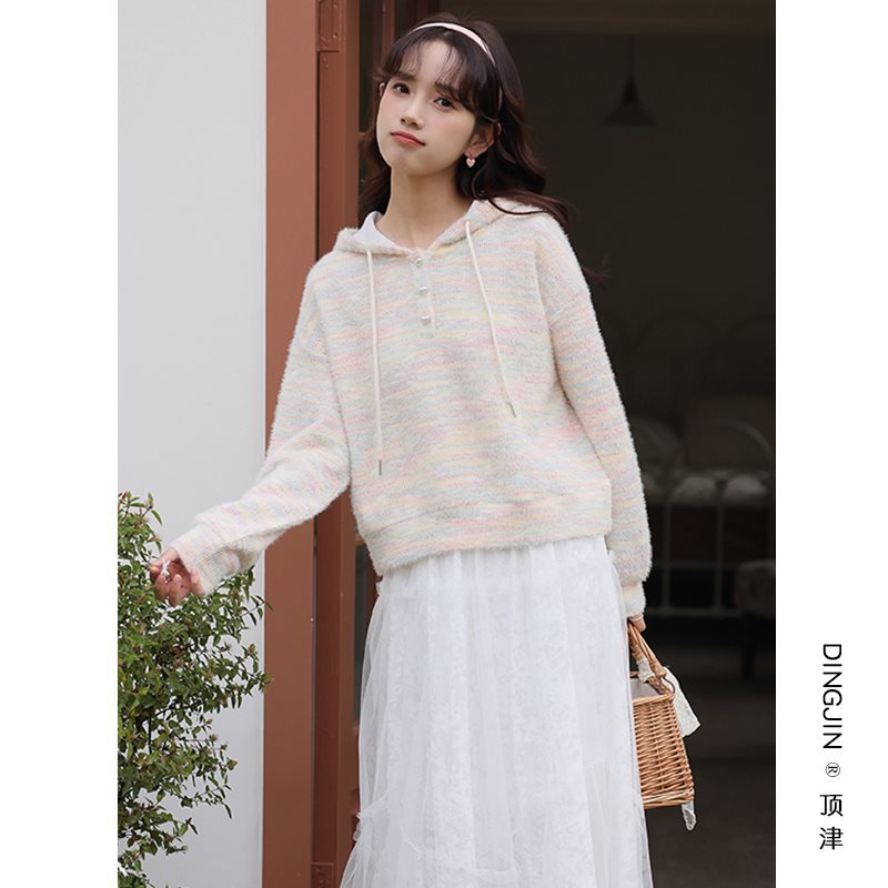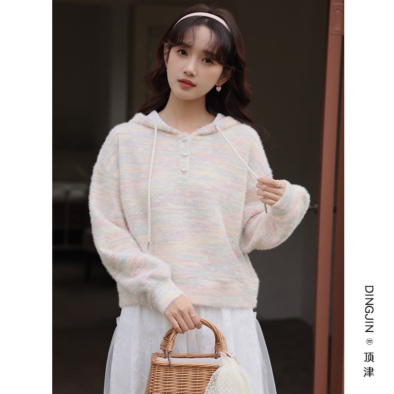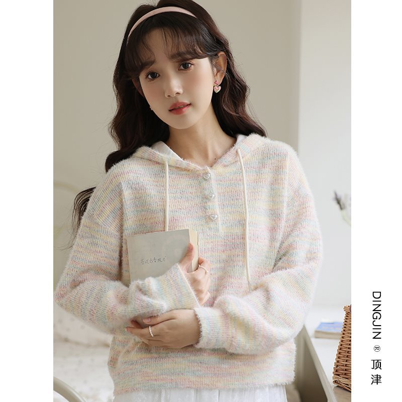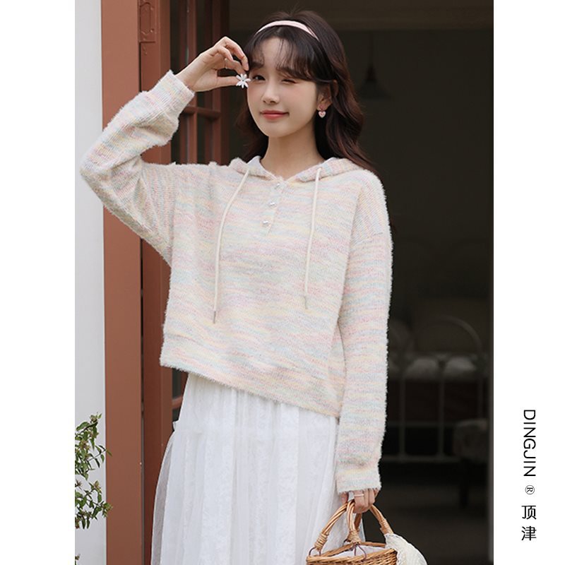 | nameOriginal | Fresh Rainbow Knitted Sweater Women's Spring and Autumn 2024 New Lazy Style Loose Slimming Hooded Top |