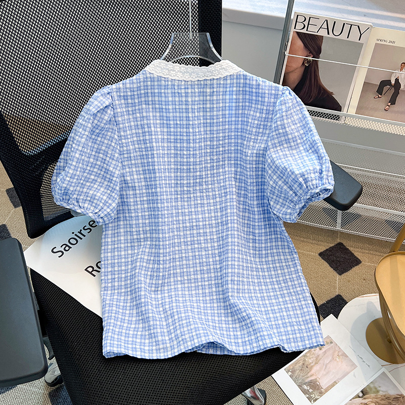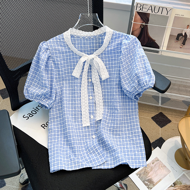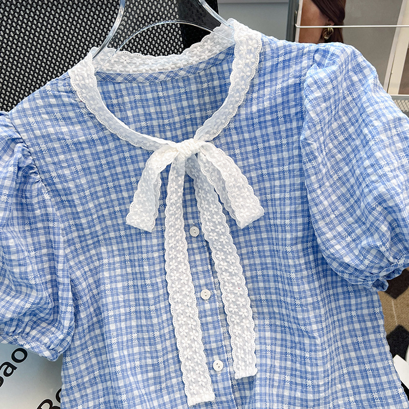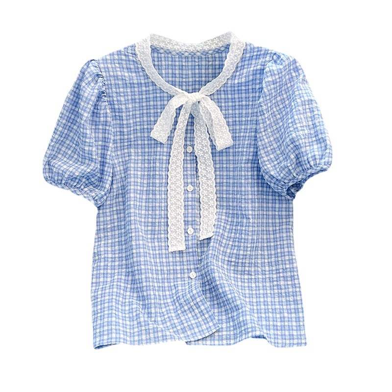 | nameOriginal | Fresh Style Lace Lace Bow Shirt Women's Summer Texture Pleated Plaid Loose Age-reducing Top |