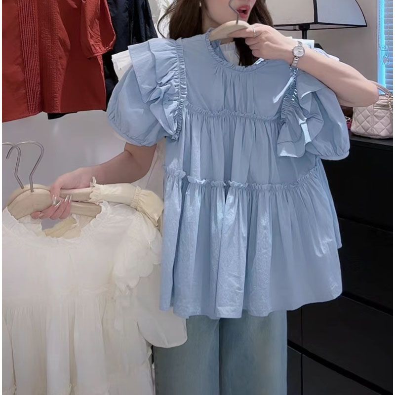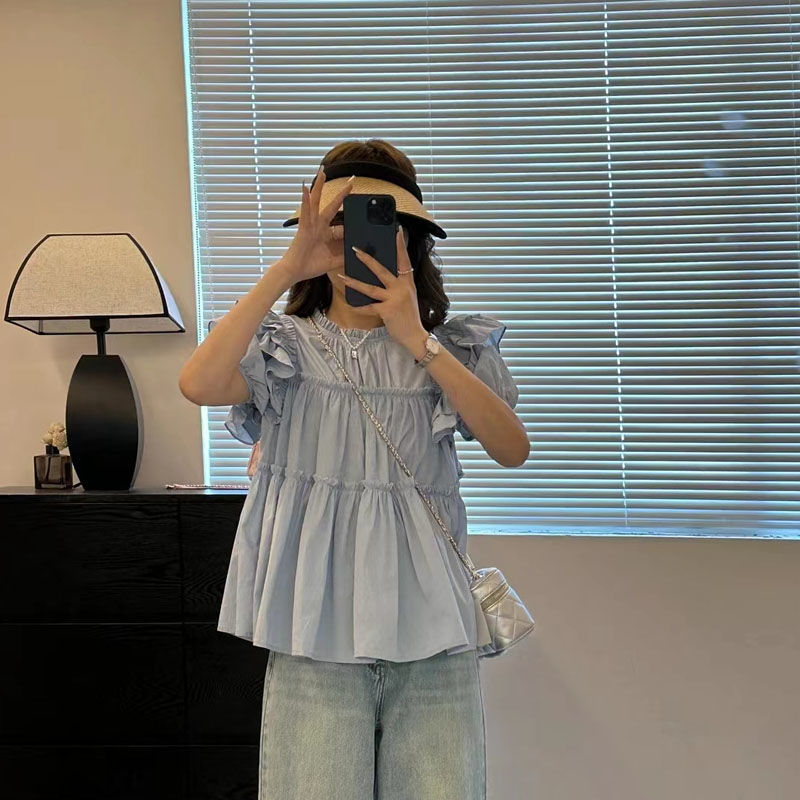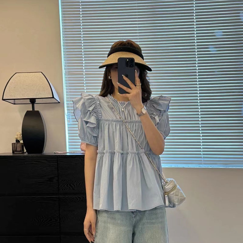 | nameOriginal | Fresh Style Short-sleeved Small Fly-sleeved Shirt Women's 2023 Summer New Style Simple Slim-fit Belly-covering Loose Shirt Top |