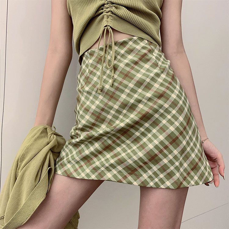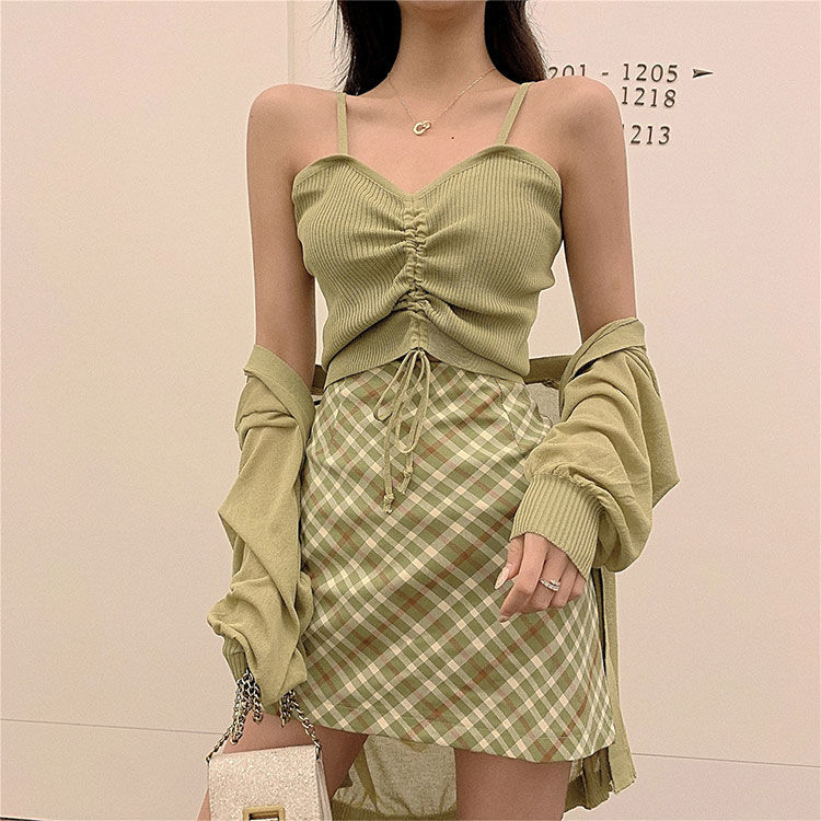 | nameOriginal | Fresh Style Women's suit Dress Summer Fashion New avocado green Cardigan Drawstring Camisole Plaid Skirt |
