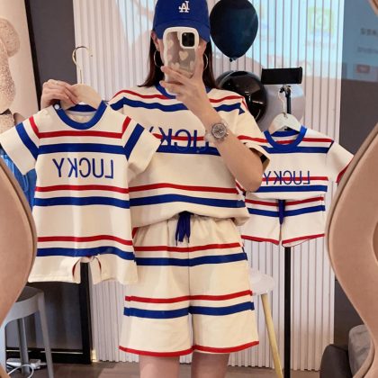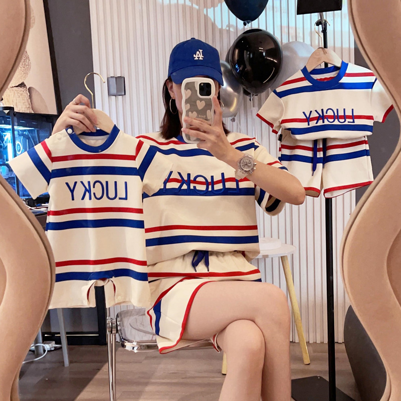 | nameOriginal | Fried Street Family Dress Summer Striped Short-sleeved T-shirt Shorts Letter Embroidered Two-piece Set plus size Baby Family Dress suit |