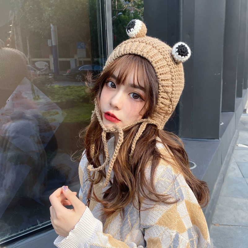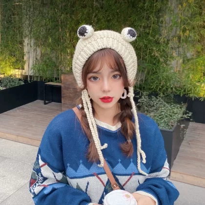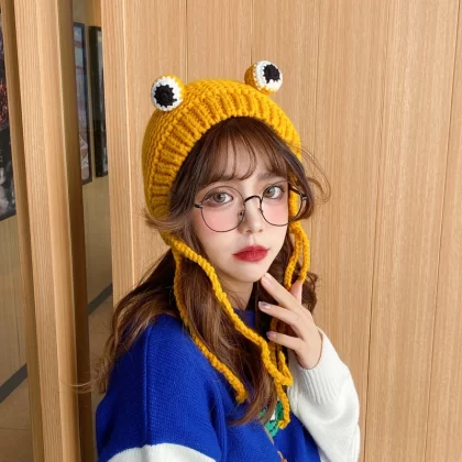 Frog knitted woolen hat for women in spring and autumn, cute ear-wrapped hood, green hat, earmuffs, warm earmuffs, autumn and winter for men