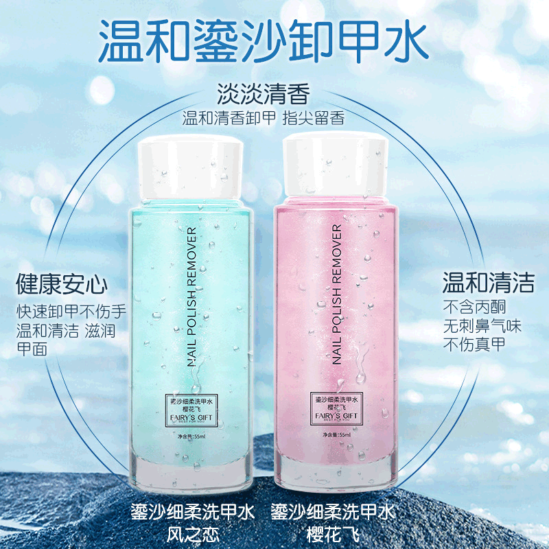 | nameOriginal | Fruit flavor nail polish nail polish remover does not hurt nail mild cleaning water physical store stall quicksand nail polish remover wholesale factory |