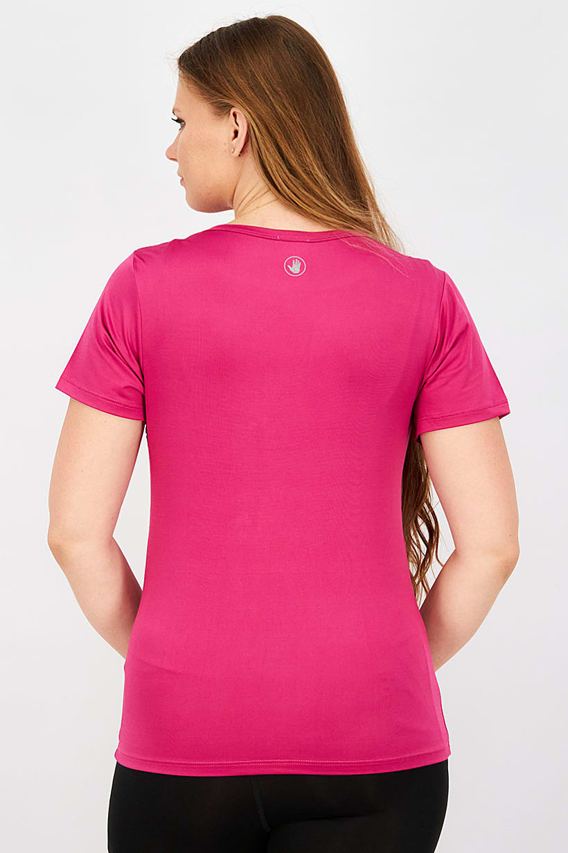 Bottom Hem : Straight, Care : Machine washable, Fit : Sportswear Fit, Ideal For : Women, Size shown : International, Thickness : Light, Disclaimer : Product color may slightly vary due to photographic lighting sources or your monitor settings., Fabrics : 100% Polyester, Pattern & Print : Graphic print, Sportswear Type : T-Shirt, Types of Closures : Pullover, Color Family : Pink, Type of Sport : Running,