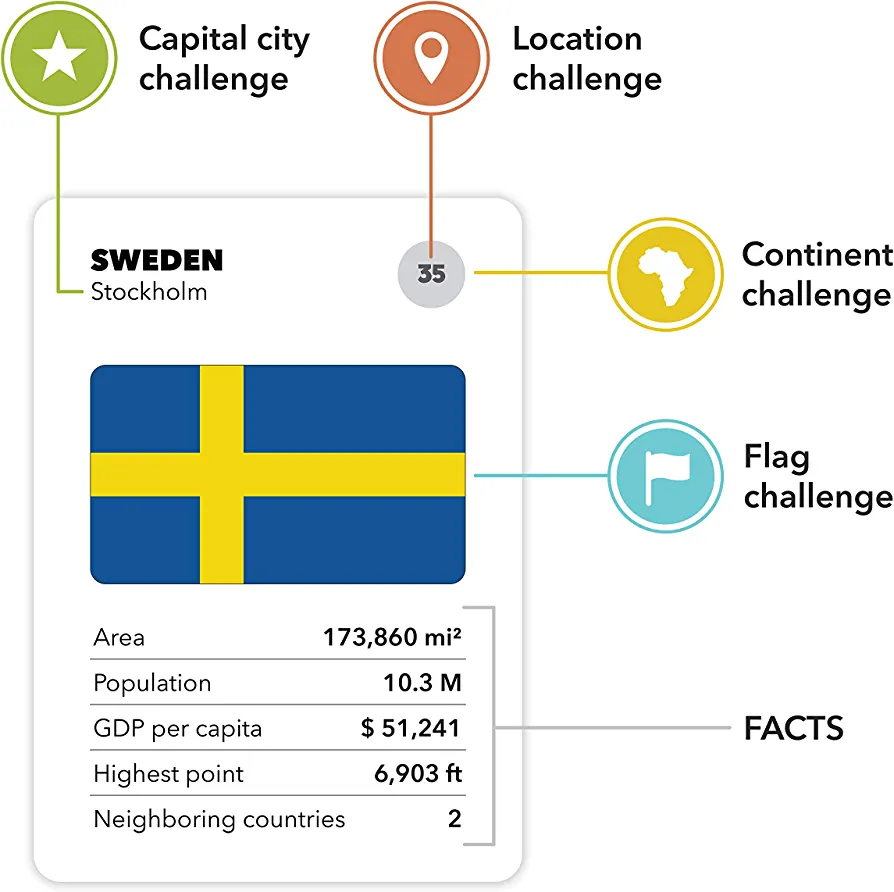But that’s not all – we also offer our Flags, Capitals & Location game, which is perfect for those who want to learn even more about the world. With over 1500 country facts included on the cards, you’ll be able to show off your knowledge of flags, capitals, and more. And with its fun and engaging gameplay, you’ll be learning without even realizing it!