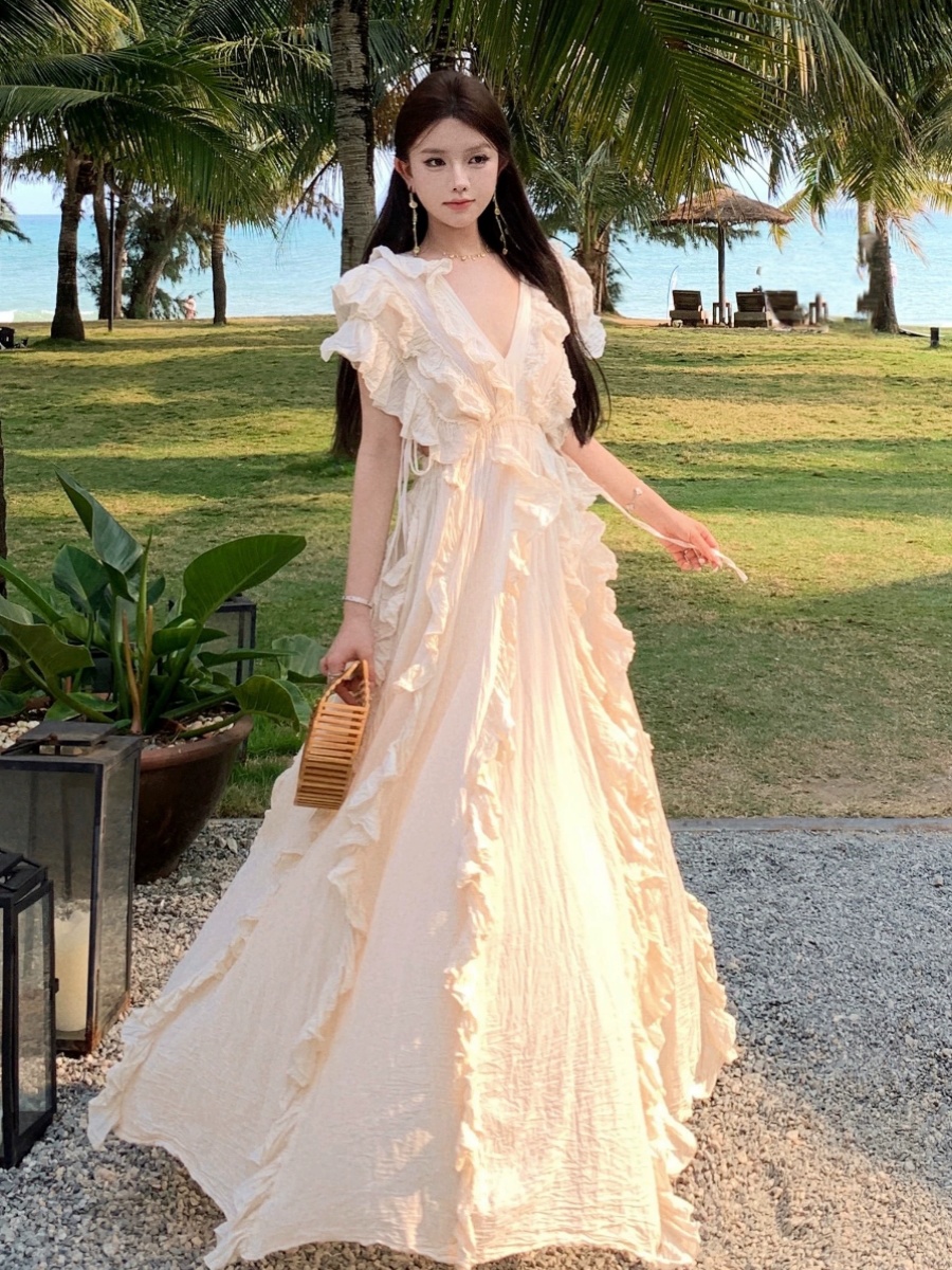 | nameOriginal | Fungus edge holiday style fat mm new v-neck skirt |
