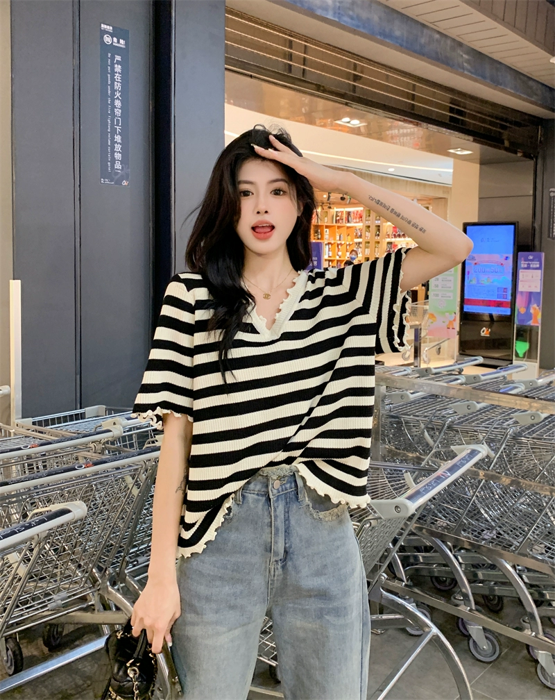 | nameOriginal | Fungus striped v-neck fat mm slimming and flesh-covering T-shirt |