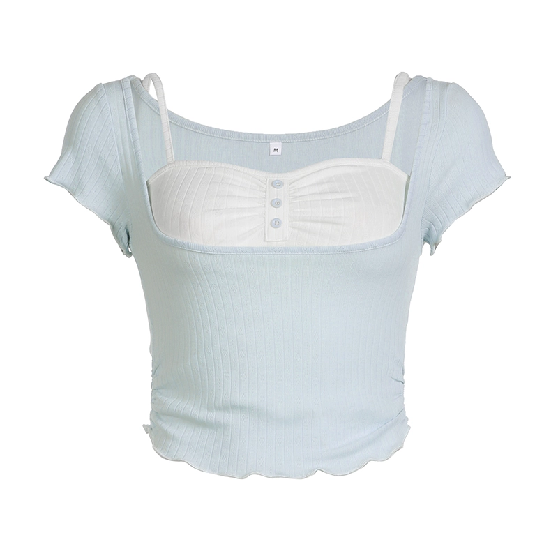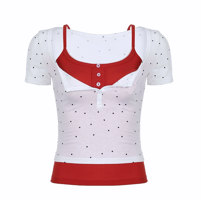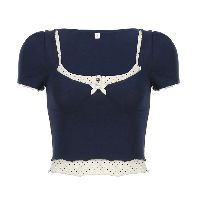 | nameOriginal | FUNOFF French bm polka dot square neck puff sleeve two-piece set short suspender T-shirt American slim short-sleeved top |