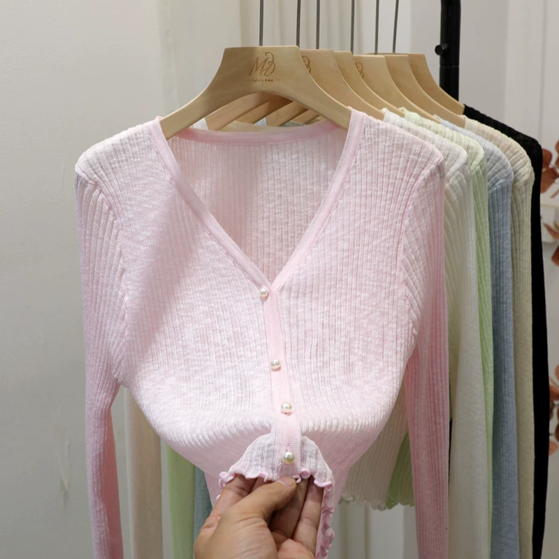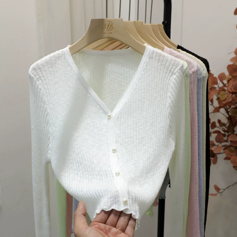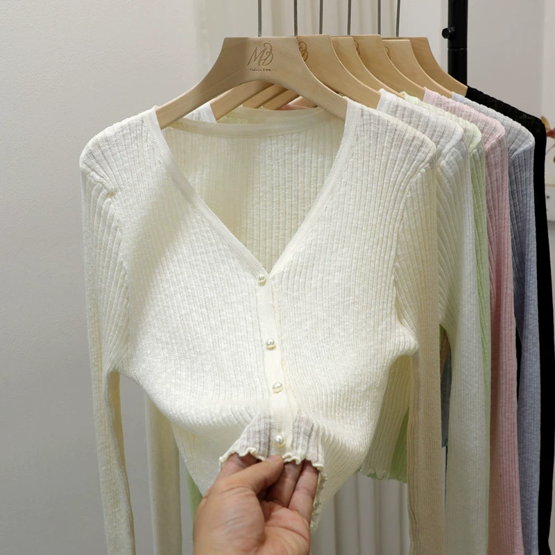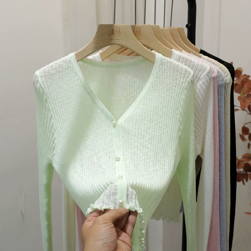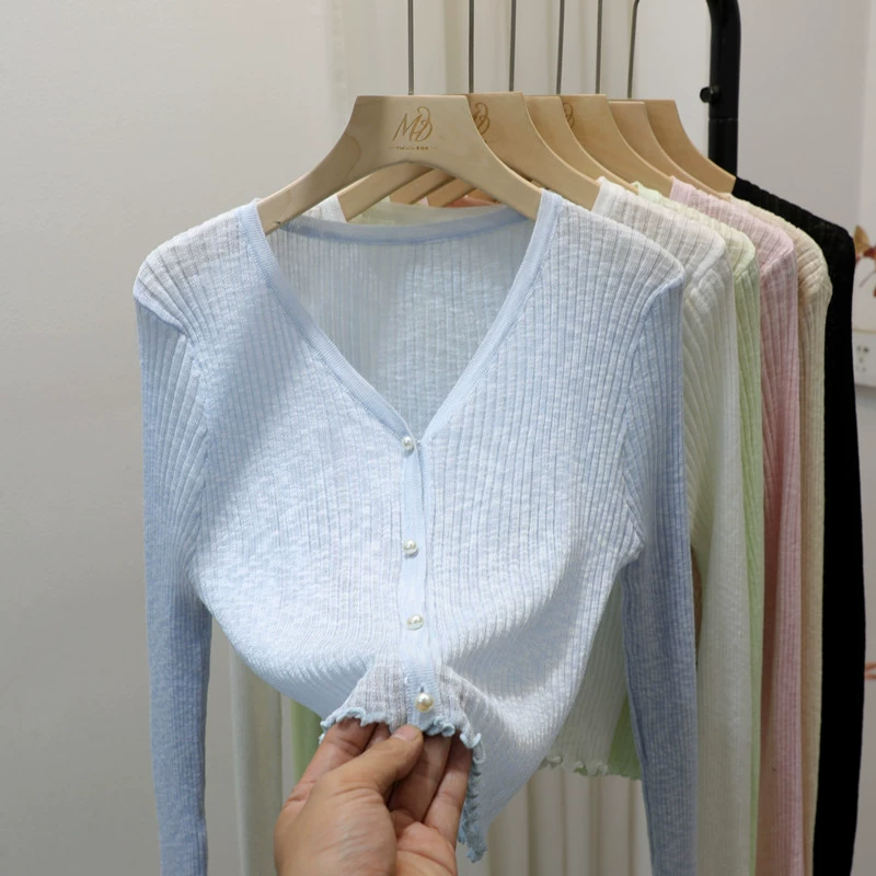 | nameOriginal | Gentle fungus-edged long-sleeved ice silk knitted cardigan sun protection suit for women thin summer Hong Kong style small suspender two-piece set |
