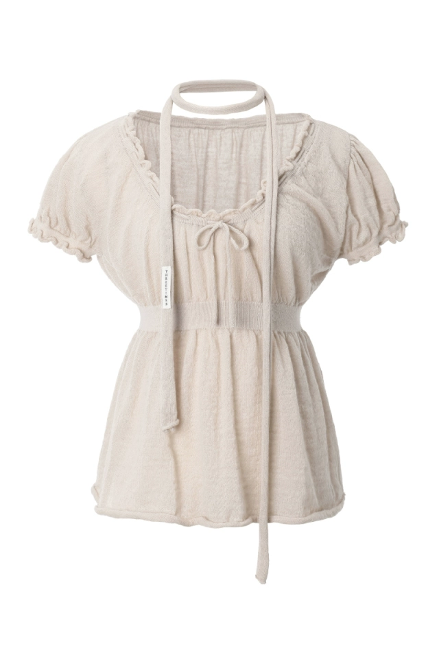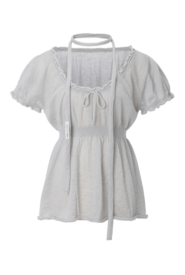 Gentle Heavy Industry Korean Style Halter Neck Bow French Elegant Square Neck Waist Slim Fit Short Sleeve Knitted Top for Women