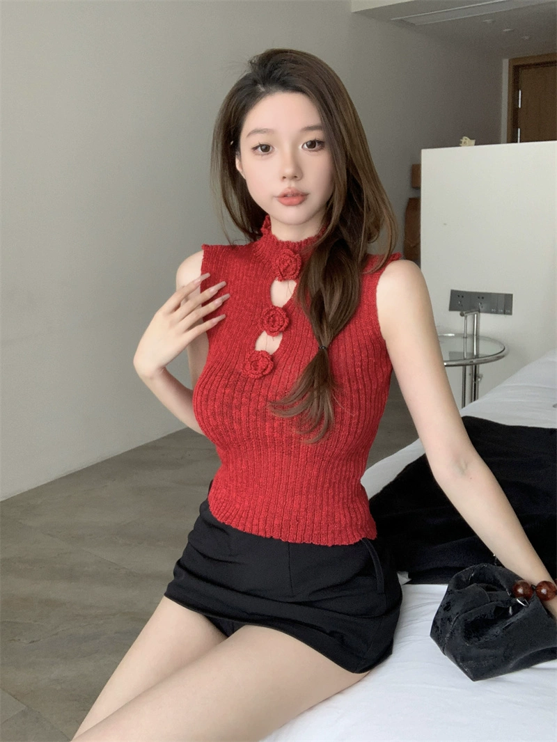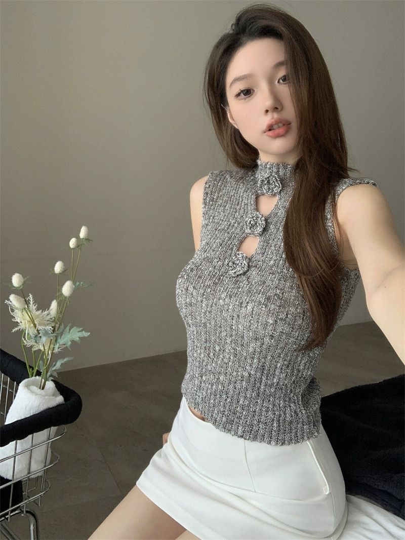 Gentle Hot Girl Stand Collar Sleeveless Knitted Vest Flowers