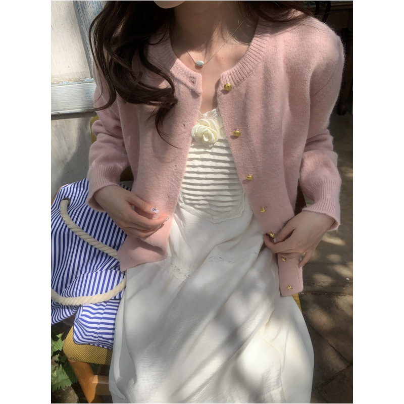Gentle Retro Small Gold Button Round Neck Knitted Cardigan Women's 2024 Autumn and Winter Loose Casual Basic All-match Sweater Jacket