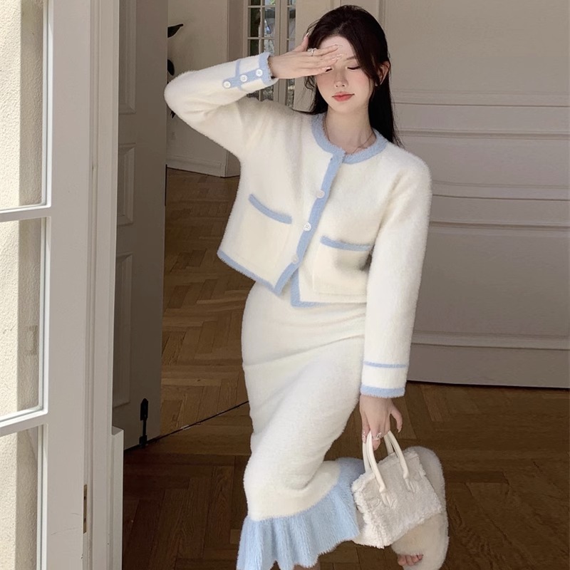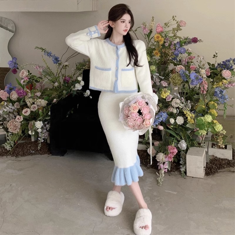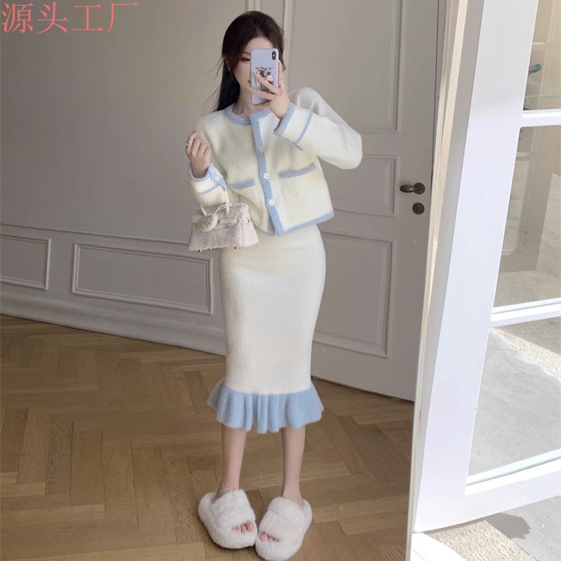 | nameOriginal | Gentle soft glutinous knitted suit women's autumn and winter New Chanel style furry coat + fishtail skirt two-piece set |