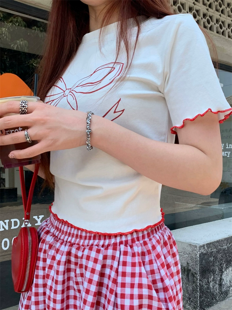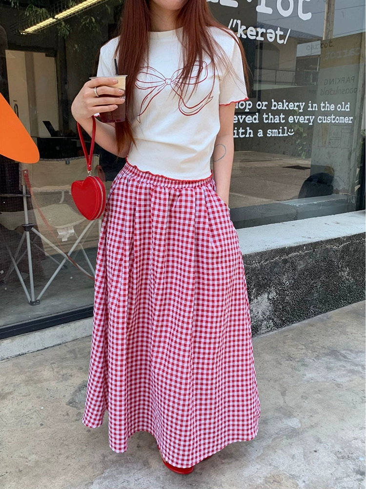 | nameOriginal | Gentle style casual versatile suit for women summer 2024 new wave edge short-sleeved T-shirt plaid long skirt two-piece set |