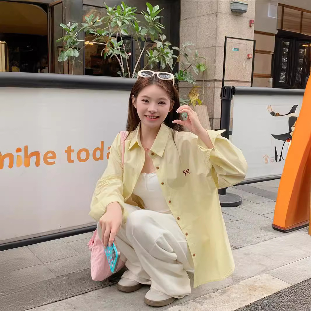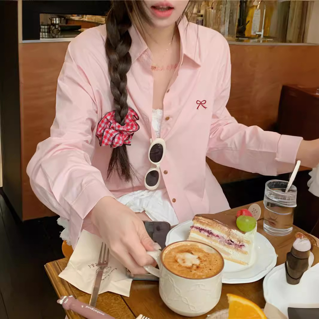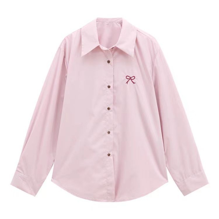 | nameOriginal | <Factory in stock Straight Hair> Gentle Style Pink Bow Embroidered Polo Collar Shirt Women Casual Top |