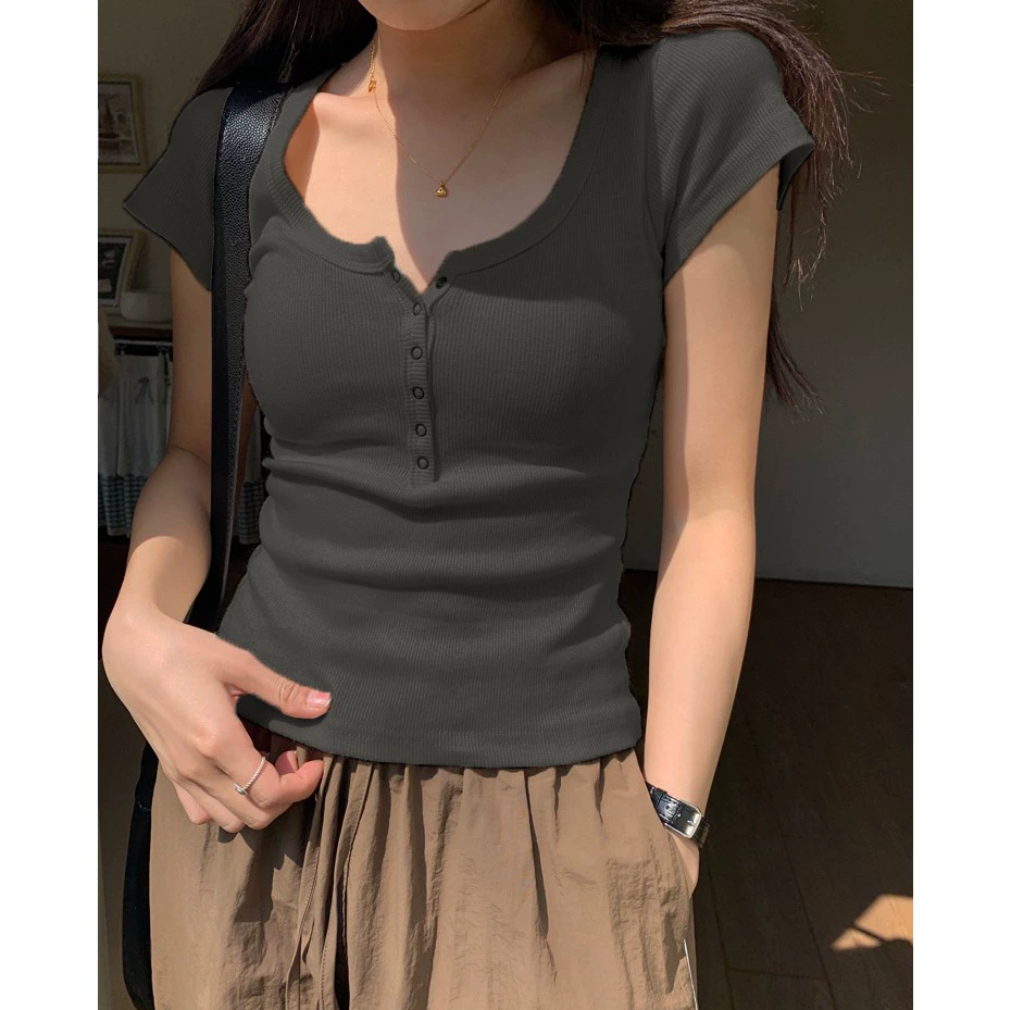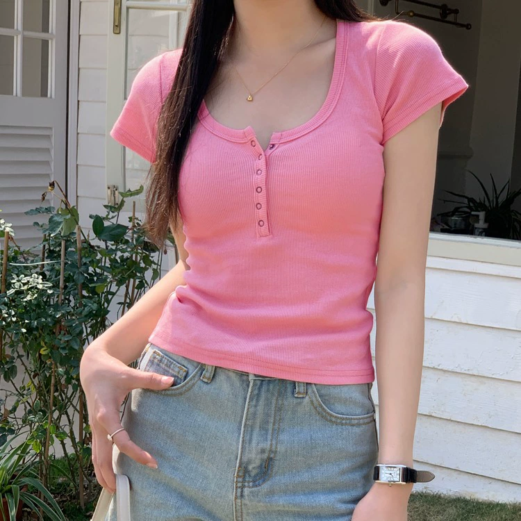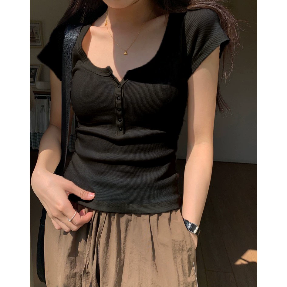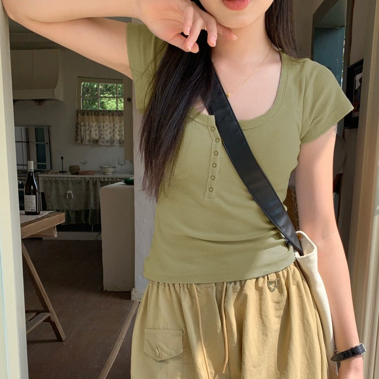 | nameOriginal | Gentle style right-shoulder U-neck short-sleeved T-shirt for women 2024 summer new tight-fitting slim design short bottoming top trendy |