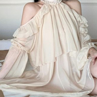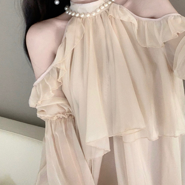 Gentle Style Ruffled Neck Chiffon Shirt Women’s French High-end Shoulder Top All-match Loose Long-sleeved Sunscreen Shirt