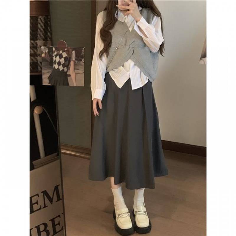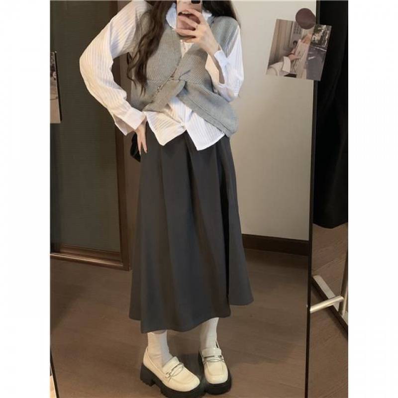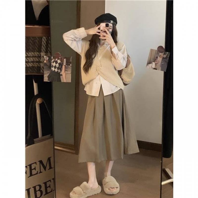 | nameOriginal | Gentle style twisted knitted vest + striped shirt + skirt women's autumn 2023 new three-piece suit |