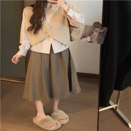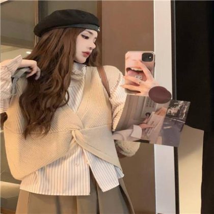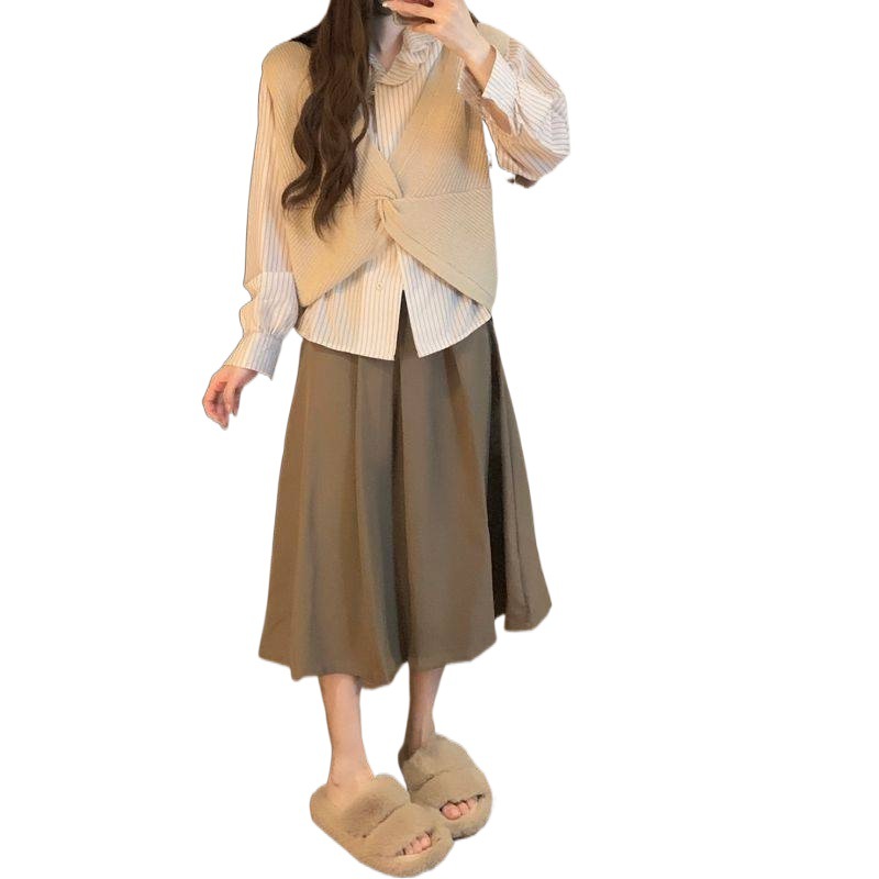 | nameOriginal | Gentle style twisted knitted vest + striped shirt + skirt women's autumn 2023 new three-piece suit |