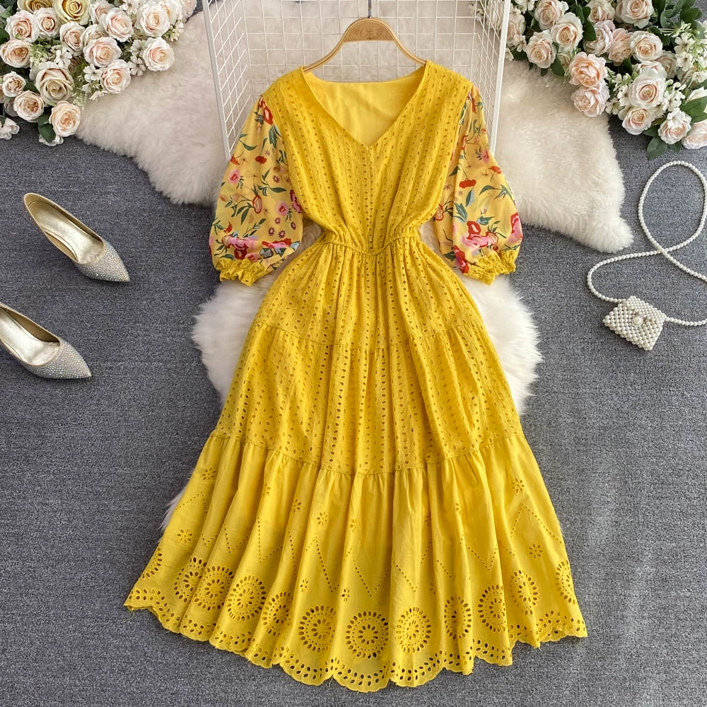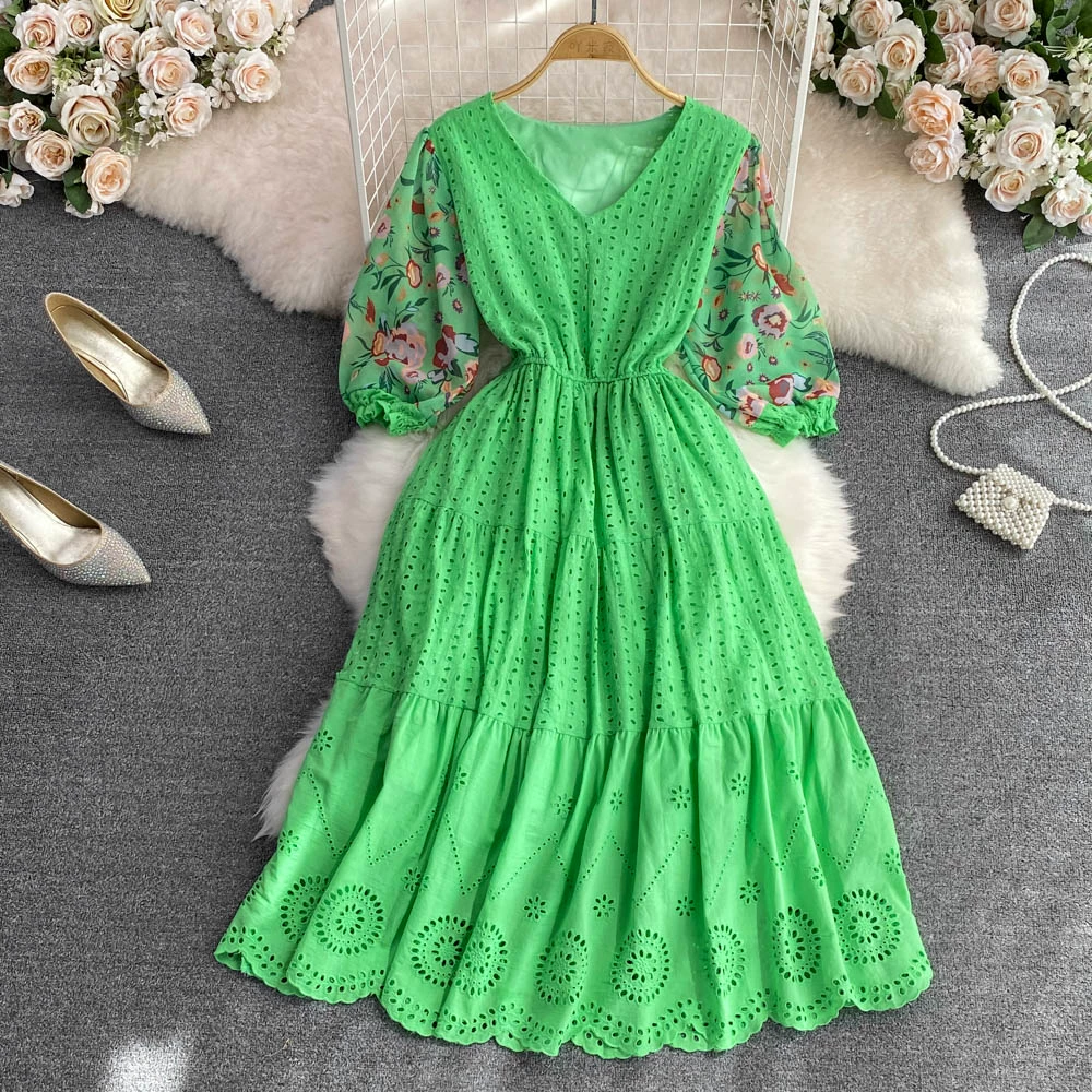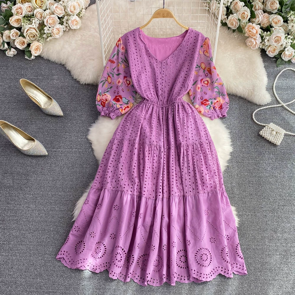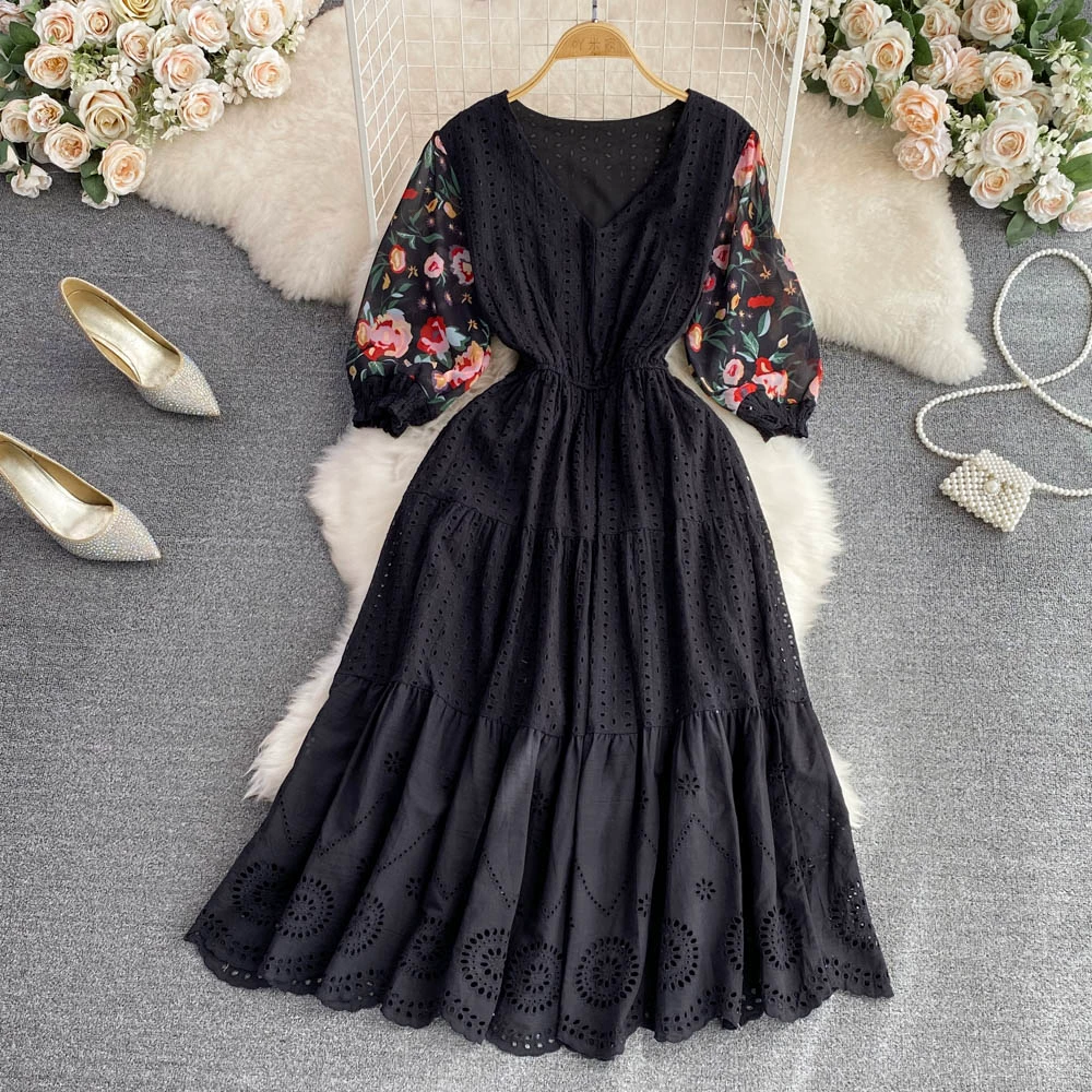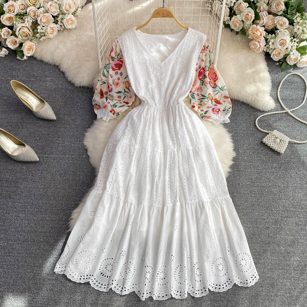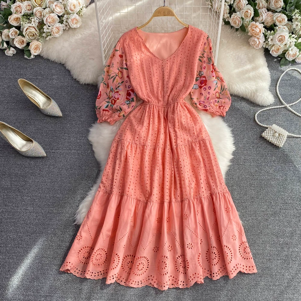 Gentle style V-neck bubble short-sleeved waist slimming A-line hollow embroidered A-line dress with high-end long skirt