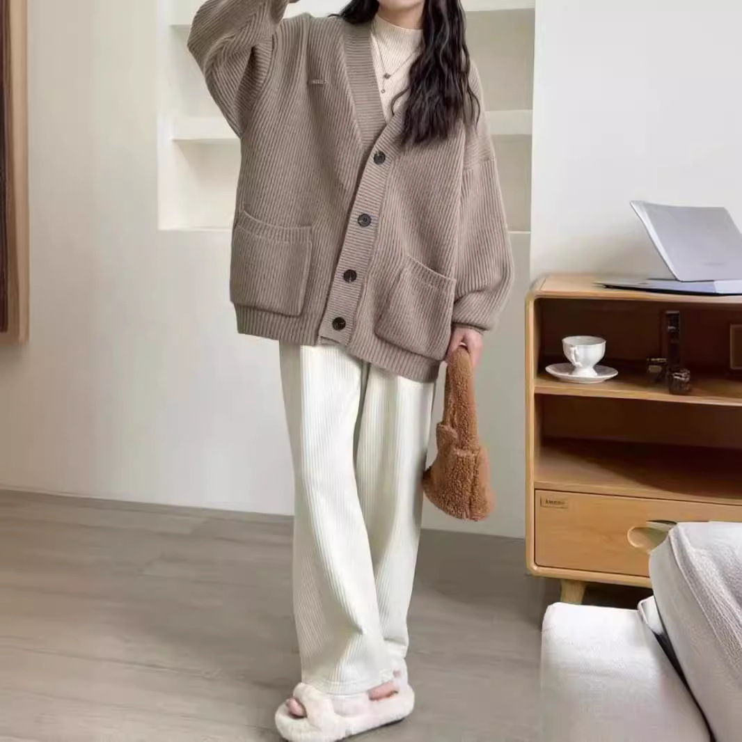 Gentle Style V-neck Cardigan Sweater Women’s 2024 Autumn and Winter New High-end Japanese Style Lazy Retro Knitted Jacket Trendy