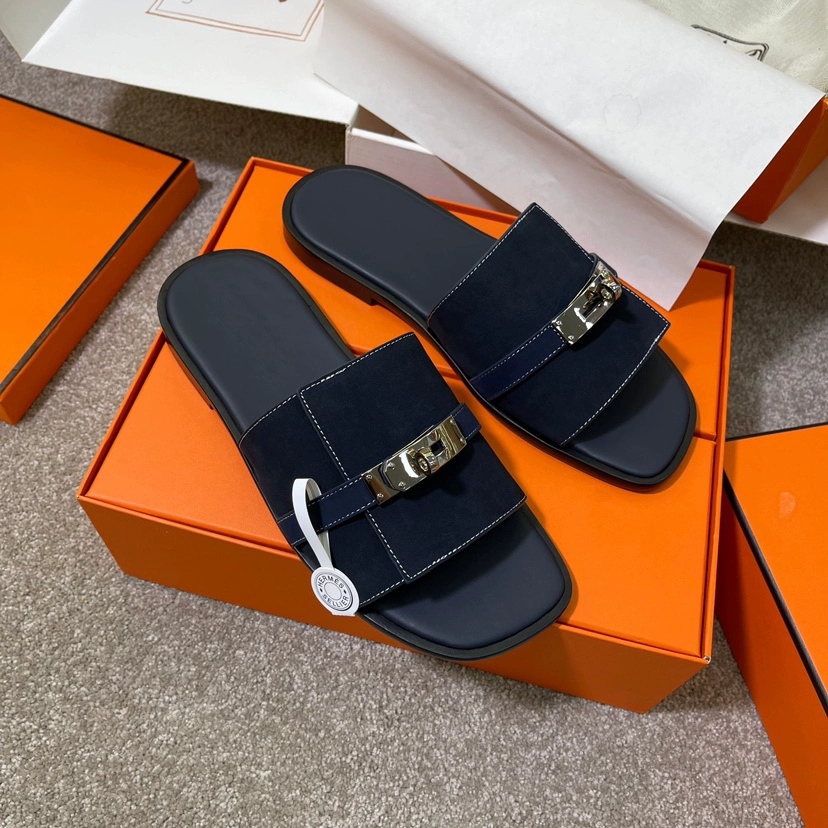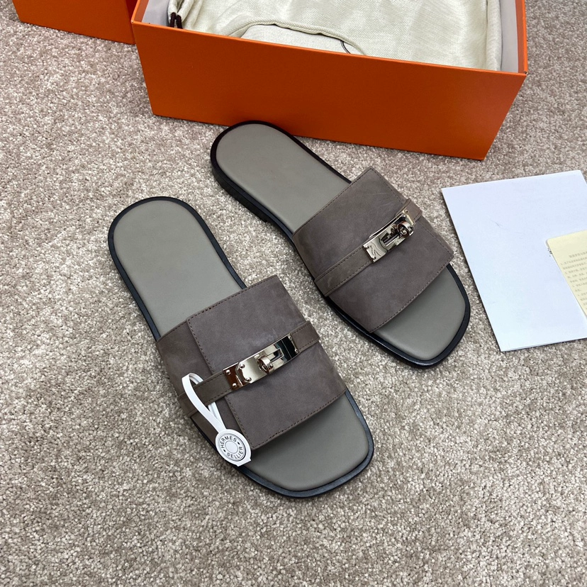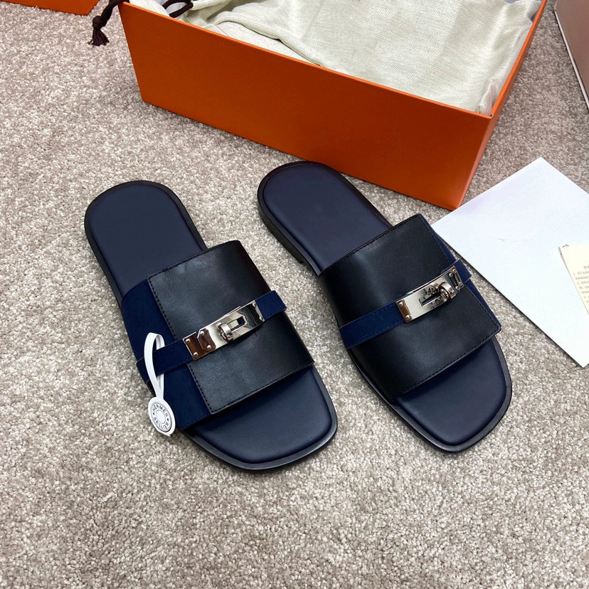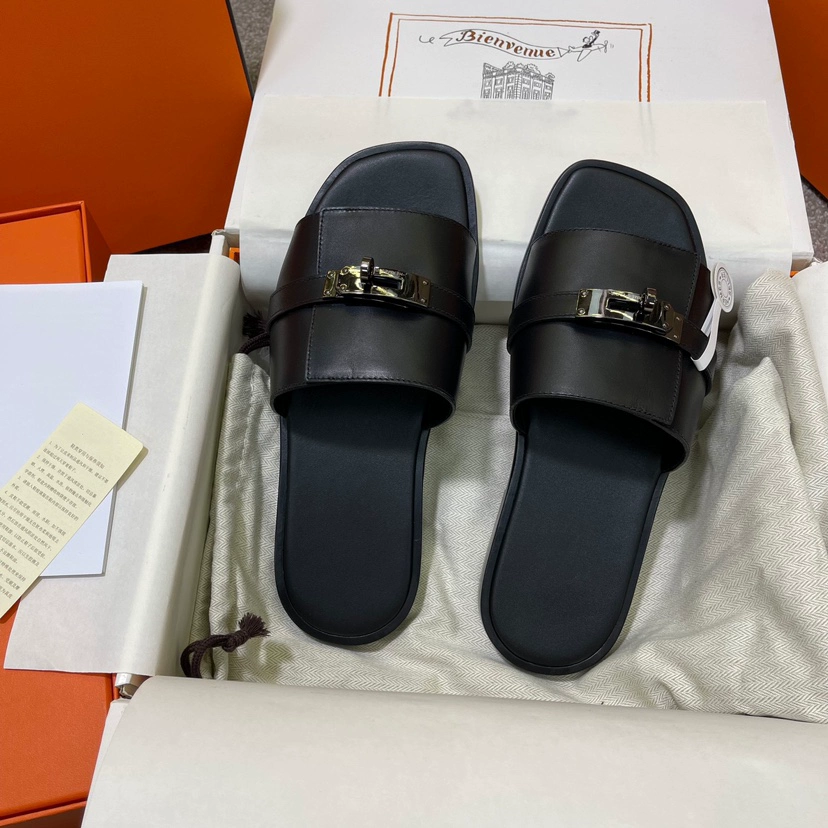 Genuine leather h home slippers men's small silver buckle outdoor flip-flops European station 2023 new sandals high-end men's advanced