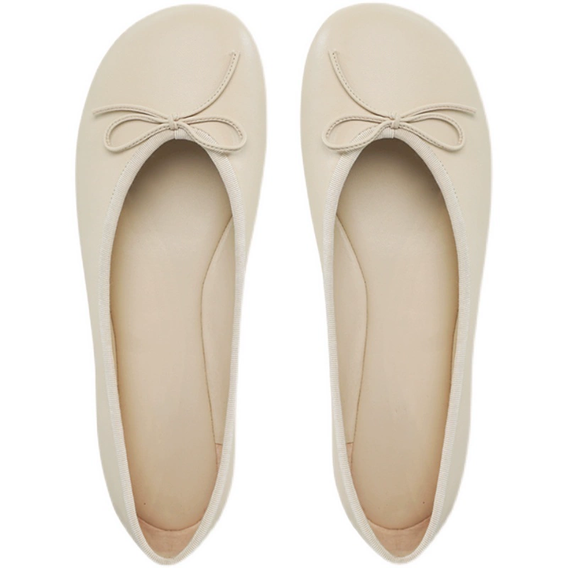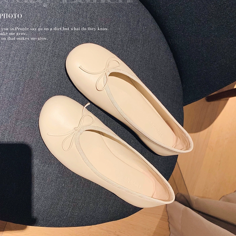 Genuine leather round toe comfortable bow flat thick heel single shoes for women grandma shoes soft sole shallow mouth casual ballet shoes for women
