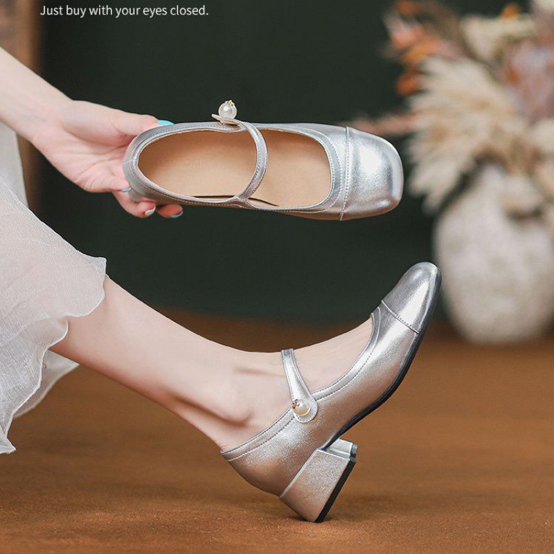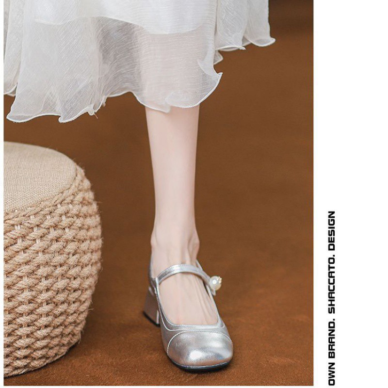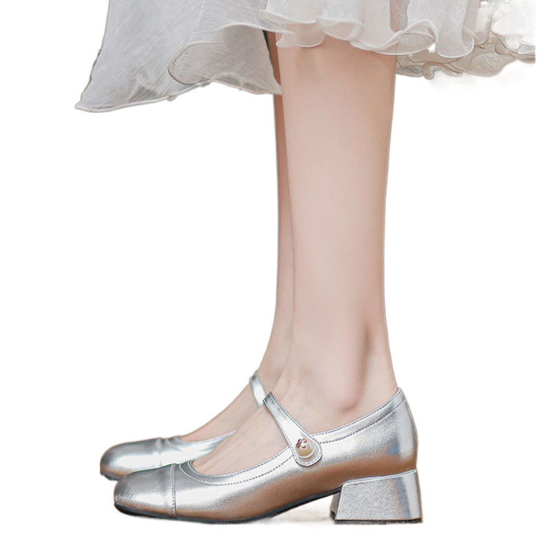 | nameOriginal | Genuine Leather Thick-heeled Mary Jane Women's Shoes 2024 New All-match silver Shallow Mouth Mid-heeled Fairy Style French Single Cross-border |