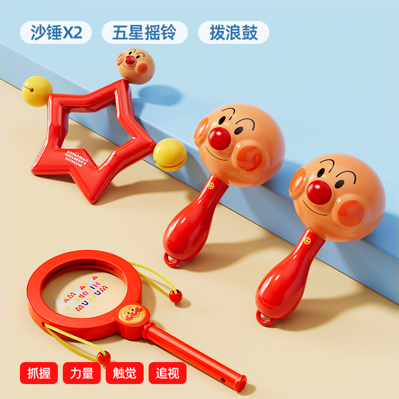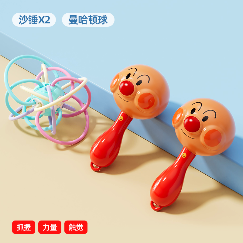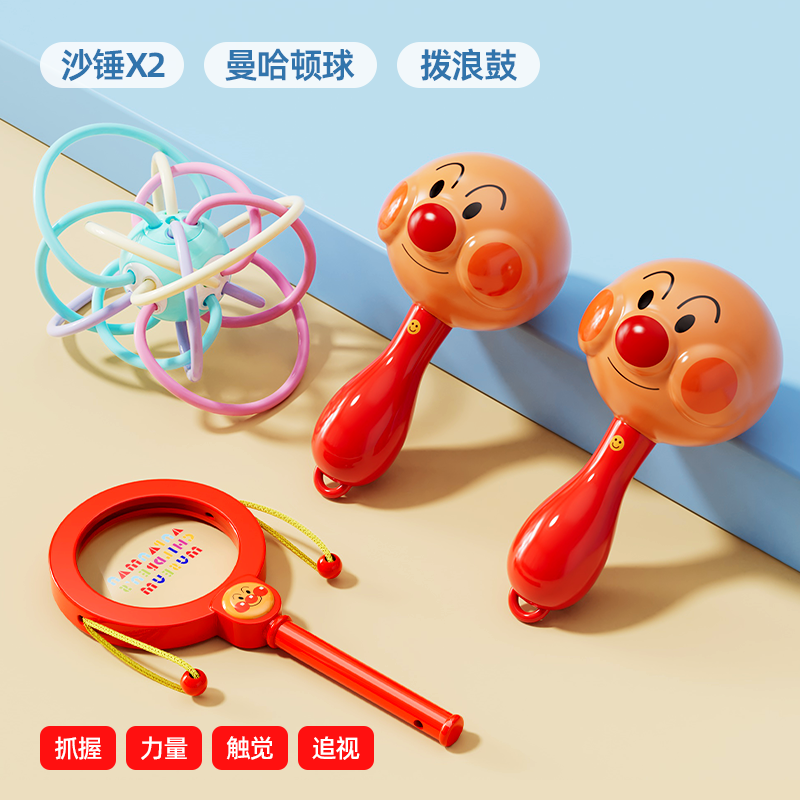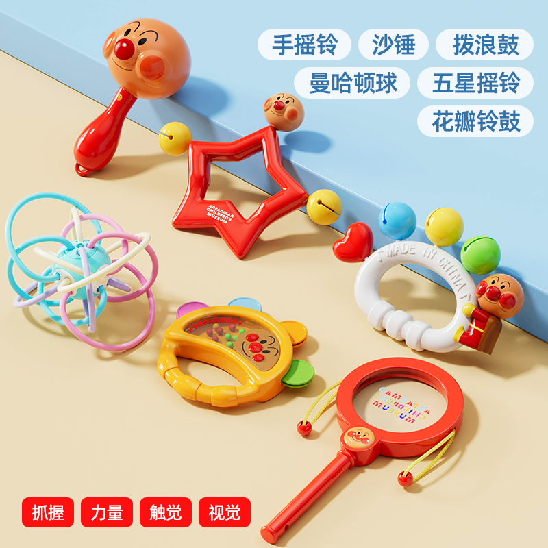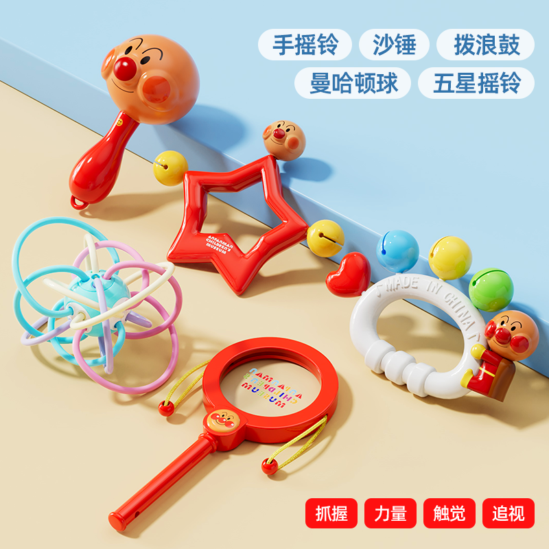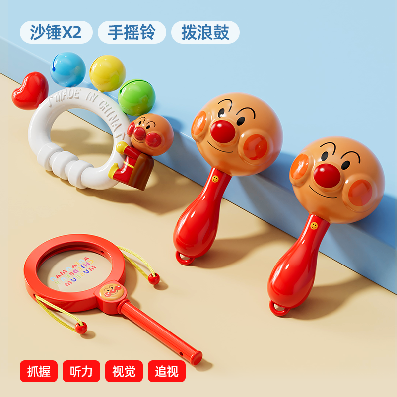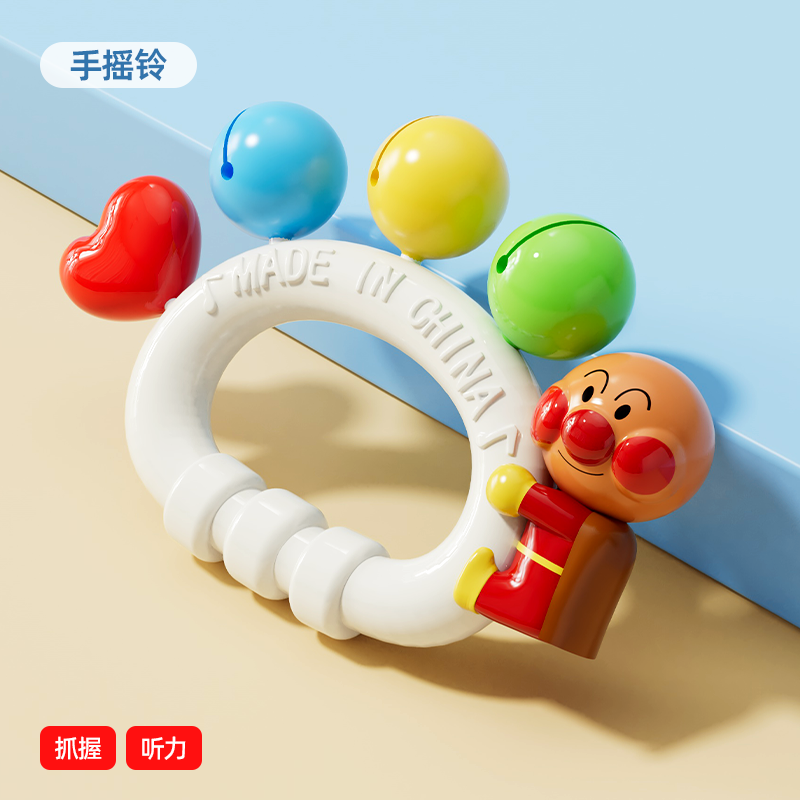 Gift looks up practicing rattle chewing hand bell
