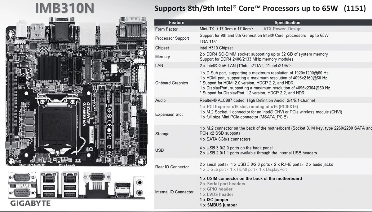| nameOriginal | Gigabyte/GIGABYTE IMB310N dual Intel network card 4COM/LVDS multi-display PCIEX16 industrial control motherboard |