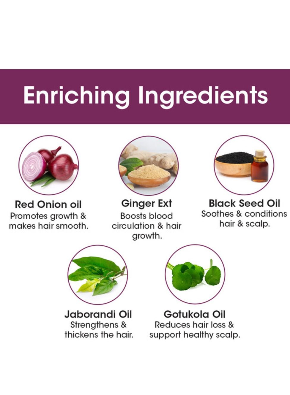 The Power of Ayurvedic Herbs: Our formula is carefully crafted with potent herbs like Onion oil, Ginger, Brahmi, Hibiscus, Moringa, Almond, and others. It’s the perfect choice for those with dull and rough hair, as it nourishes, repairs, and revitalizes your hair.