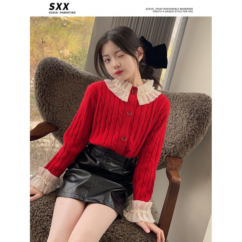 Girls' 2024 spring new long-sleeved lace collar twist knitted sweater cardigan