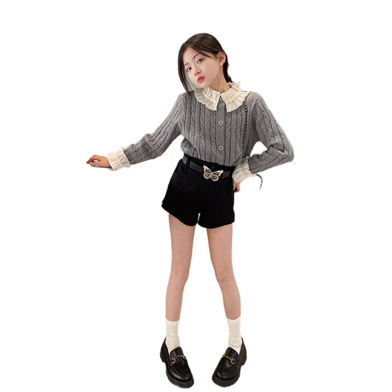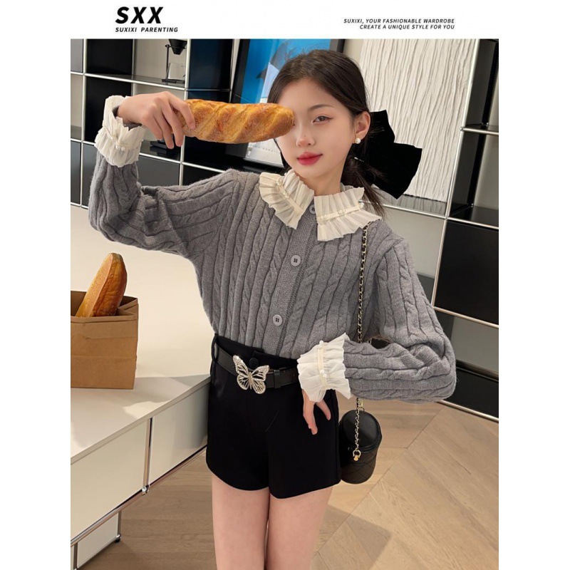 Girls’ 2024 spring new long-sleeved lace collar twist knitted sweater cardigan
