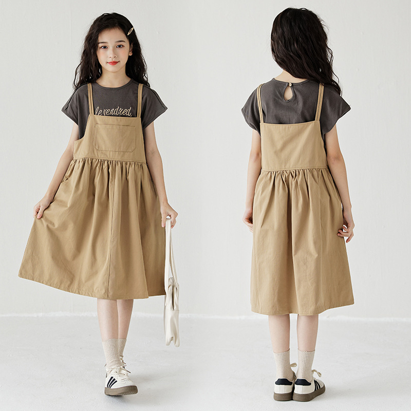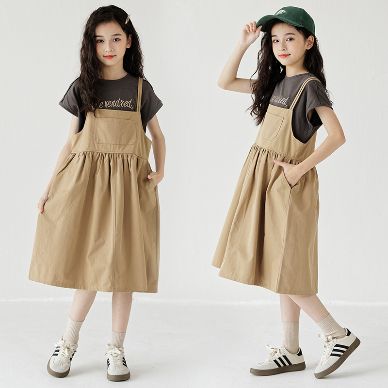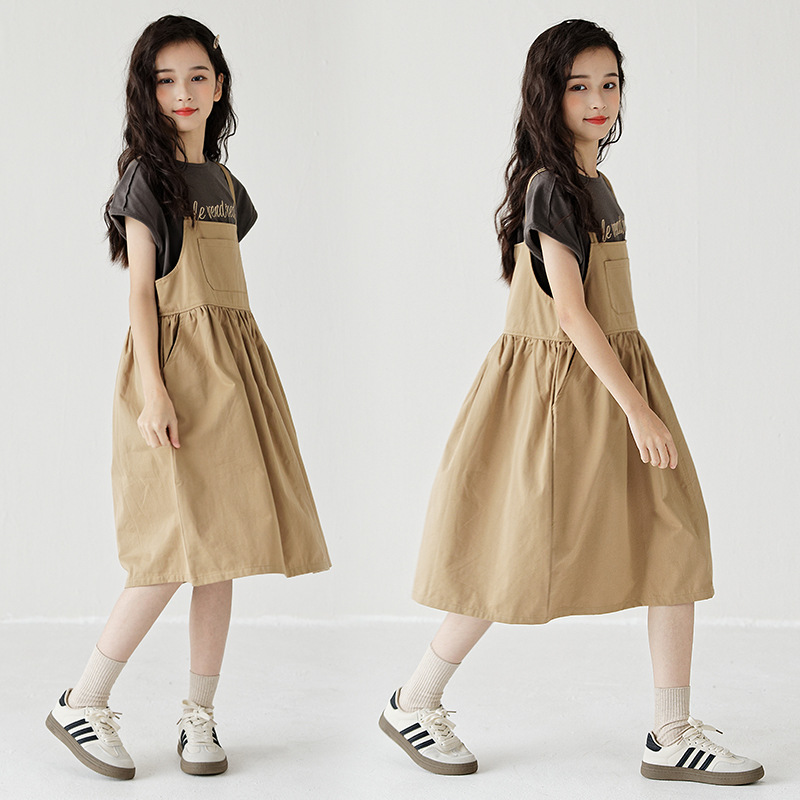 | nameOriginal | Girls' 2024 suspender suit Korean style new thin soft khaki suspender skirt western style T-shirt two-piece set |