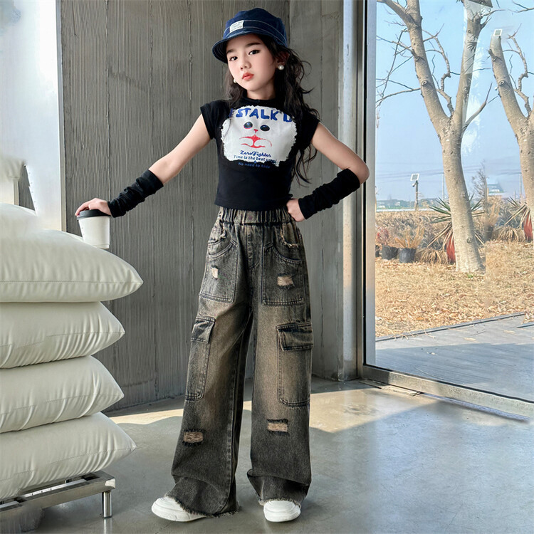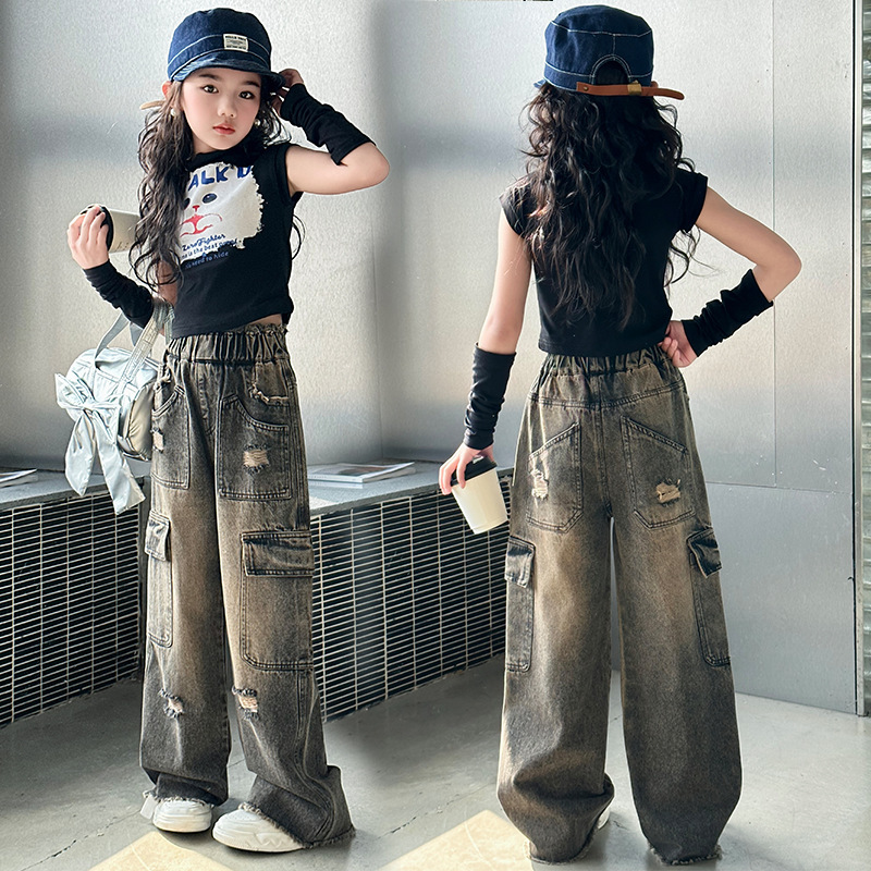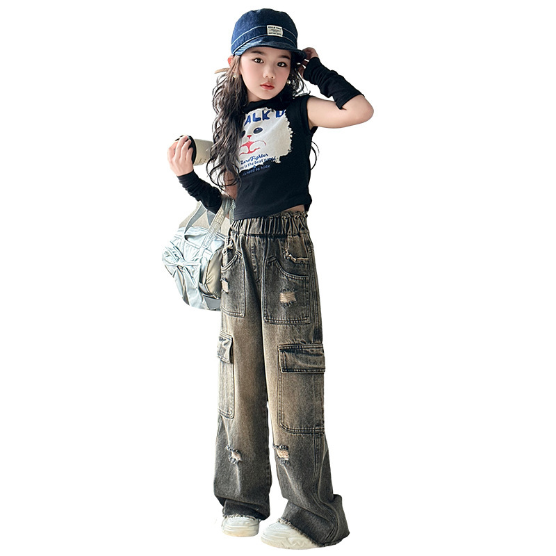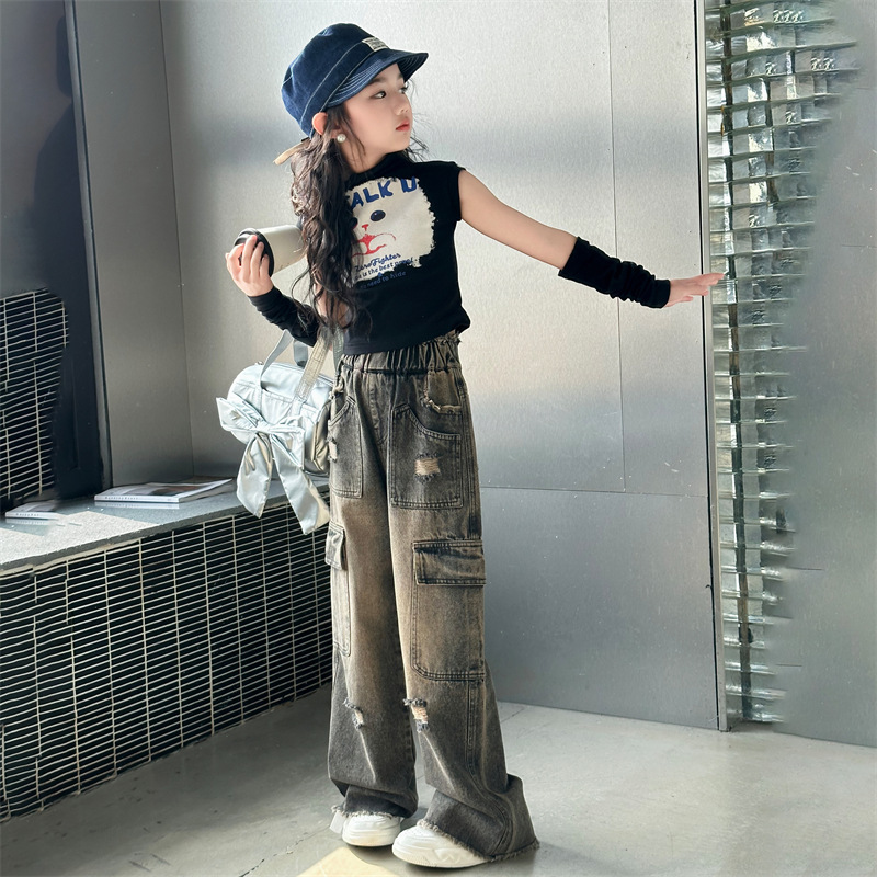 Girls' Autumn Jeans suit 2024 New Korean Style Sleeveless Vest Wide Leg Denim Covers Trendy