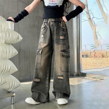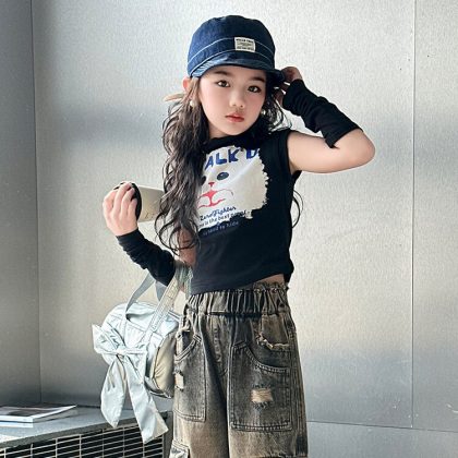 Girls’ Autumn Jeans suit 2024 New Korean Style Sleeveless Vest Wide Leg Denim Covers Trendy