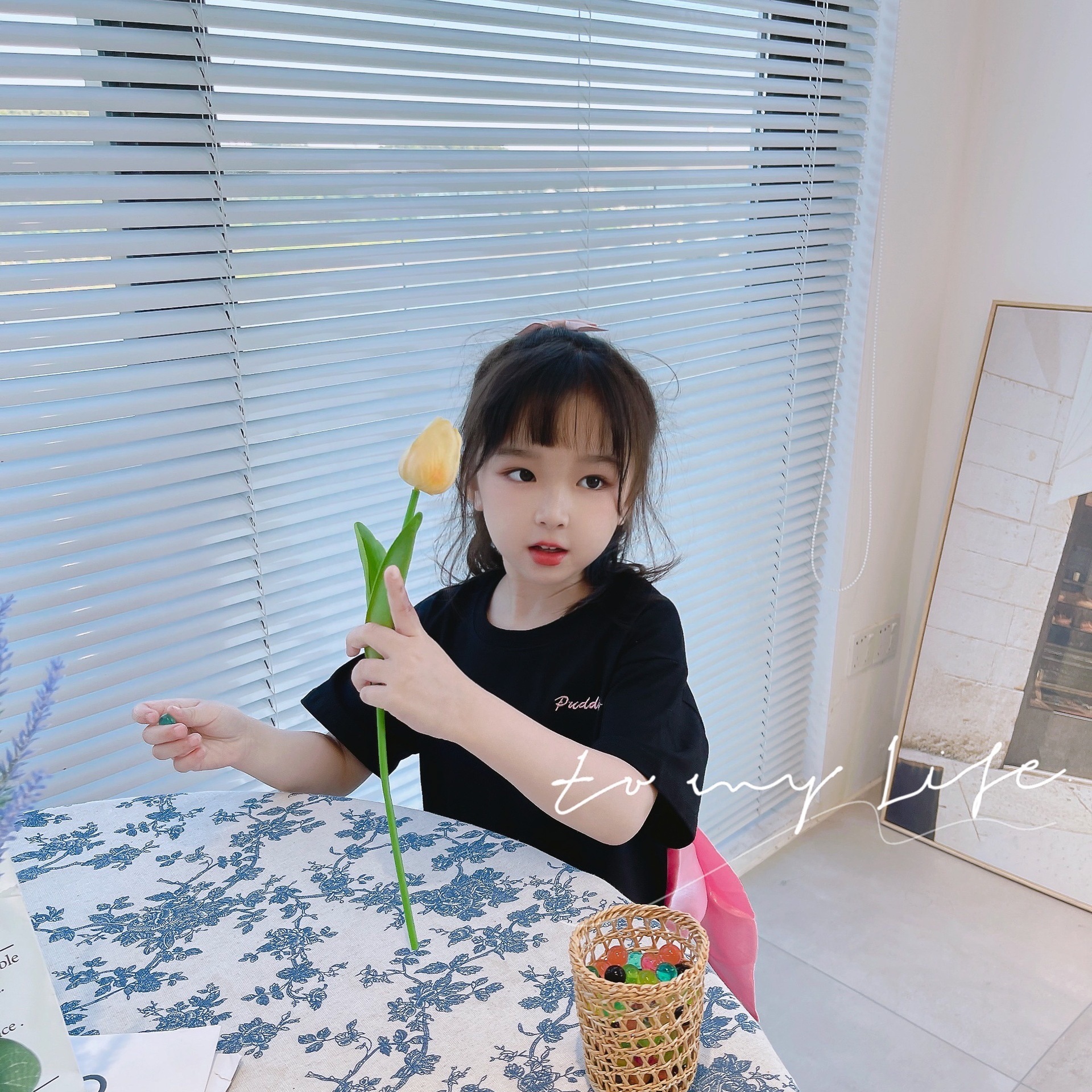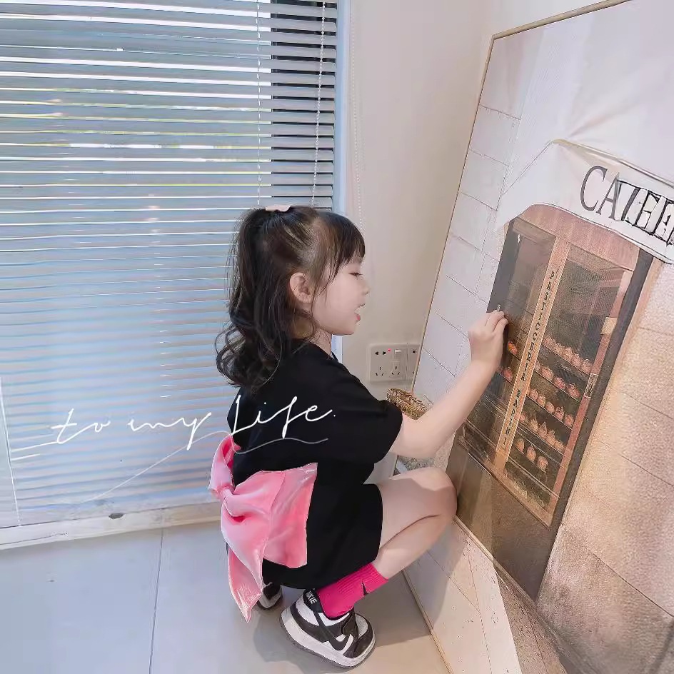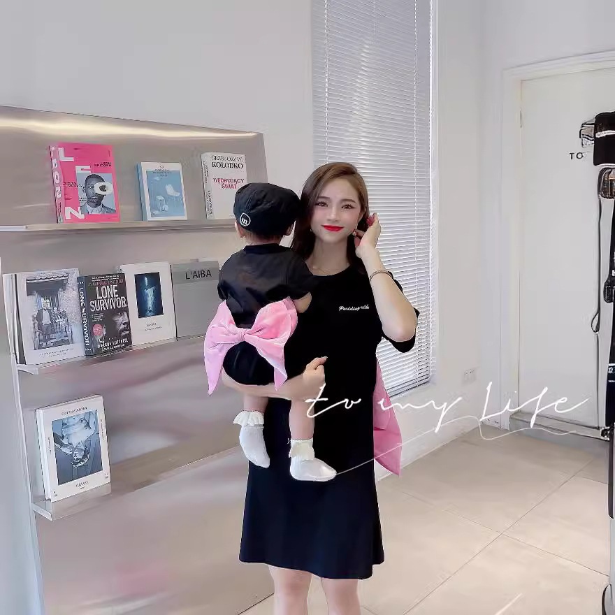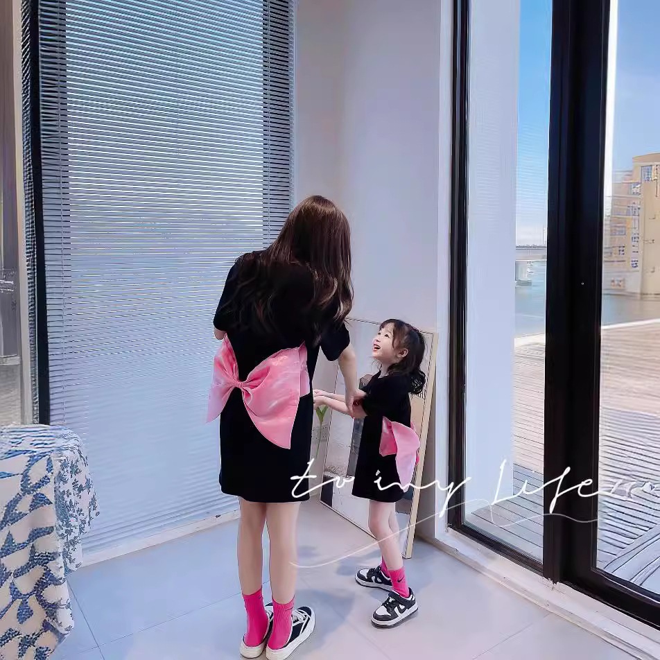 Girls black short-sleeved T-shirt skirt 2024 summer Korean family of three parent-child design bow dress.
