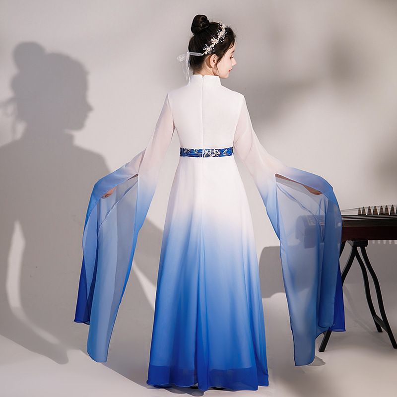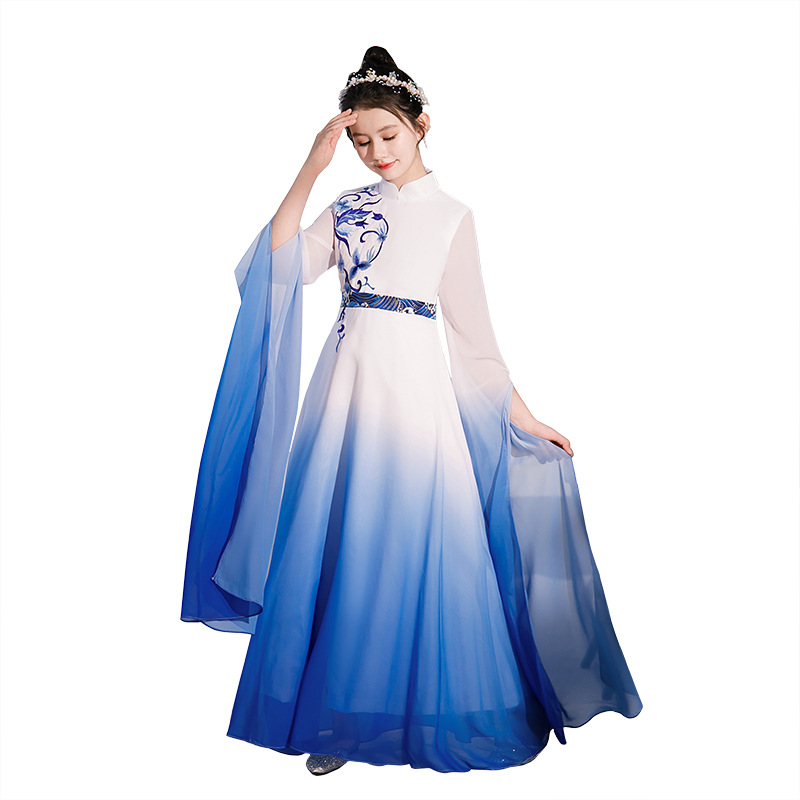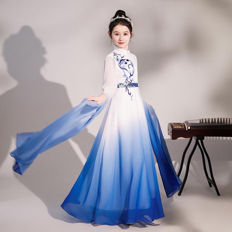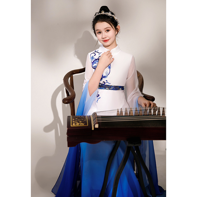 Girl’s blue guzheng costume middle and big children’s folk music art exam evening dress chorus solo classical children’s dress