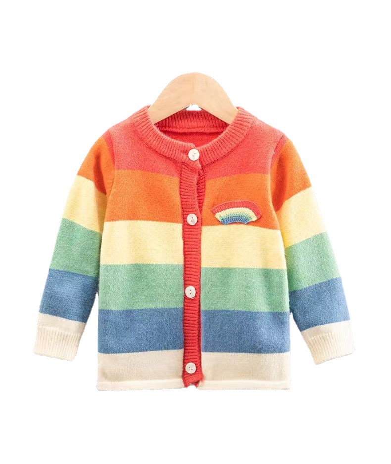 Girls’ Cardigan Sweater Coat Spring and Autumn Children’s Wear 2022 New Arrival Rainbow Striped Children’s Sweater Stylishly Fashionable Outer Riding