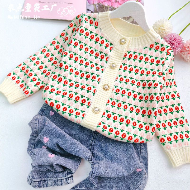 Girls’ Cardigan Sweater New Spring and Autumn Children’s Square Coat Korean Style Baby Girl Knitted Sweater Autumn A01