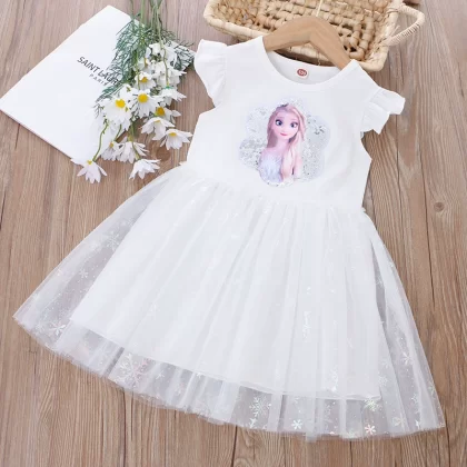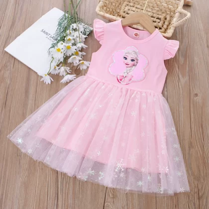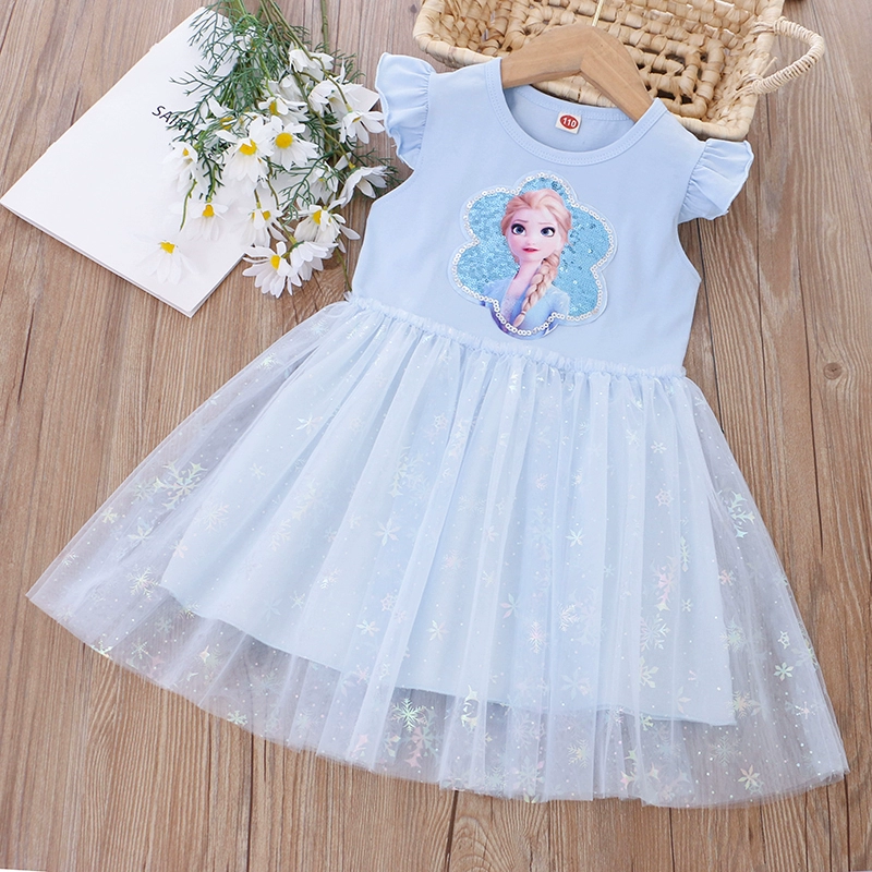 Girls Cartoon Princess Sequin Summer Short Sleeve Dress