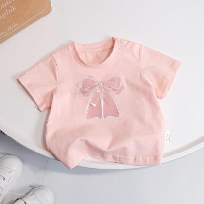 | nameOriginal | Girls' Children's Clothing Summer Short-sleeved Candy Color Fashionable Western Style Simple Bow Small and Medium-sized Children's Short-sleeved Sweet T-shirt |