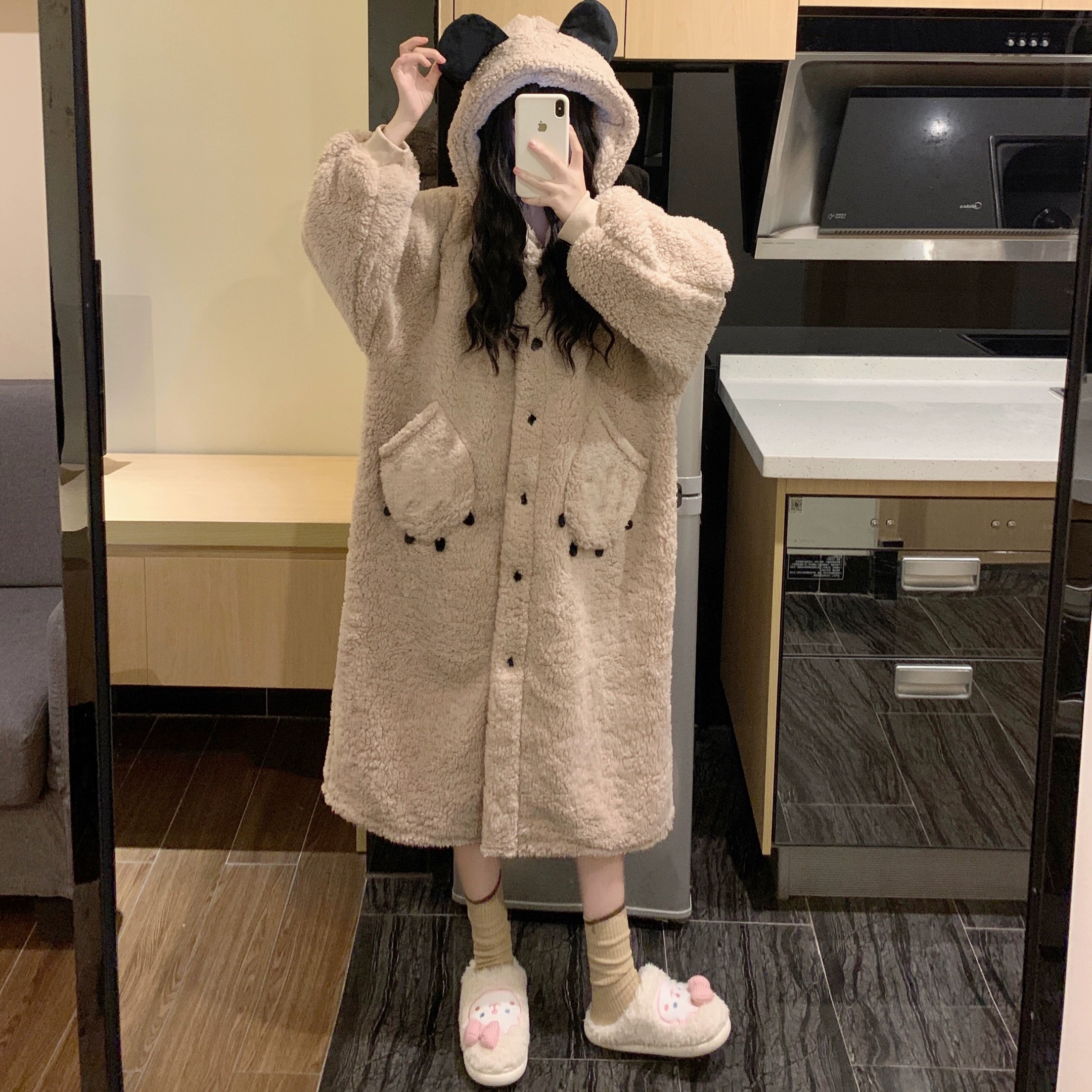 | nameOriginal | Girl's cute bear hooded coral velvet pajamas for women winter new style plus velvet thickened long-sleeved home nightgown and nightgown |