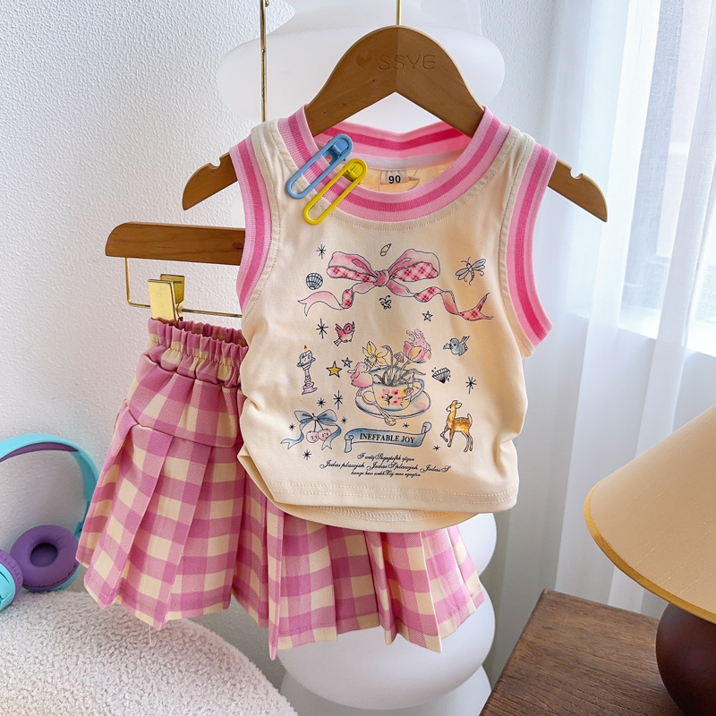 Girls Cute Vest suit Summer New Fashion Printed Vest Plaid Skirt Two-piece Set CM0107