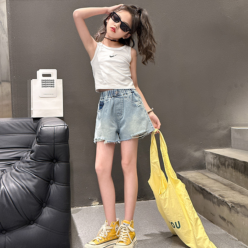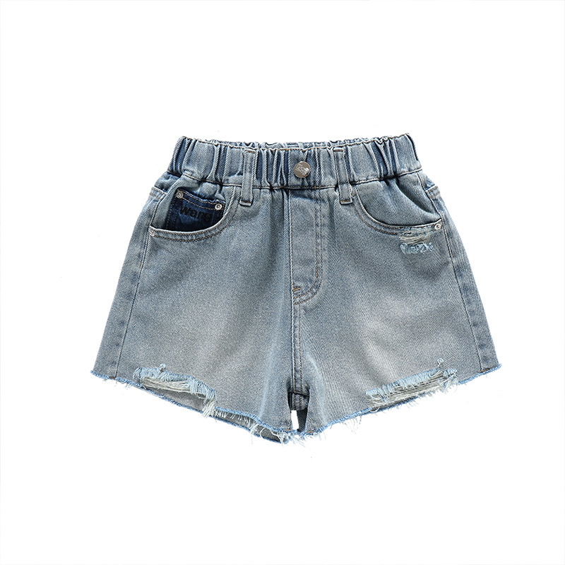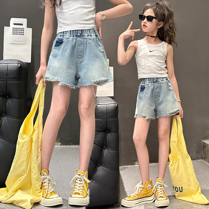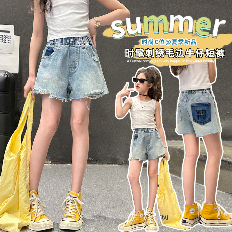 | nameOriginal | Girls' Denim Shorts Summer 2024 New Korean Style Middle and Big Children's Fashionable Popular Embroidered Joker Ripped Shorts Trendy |