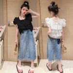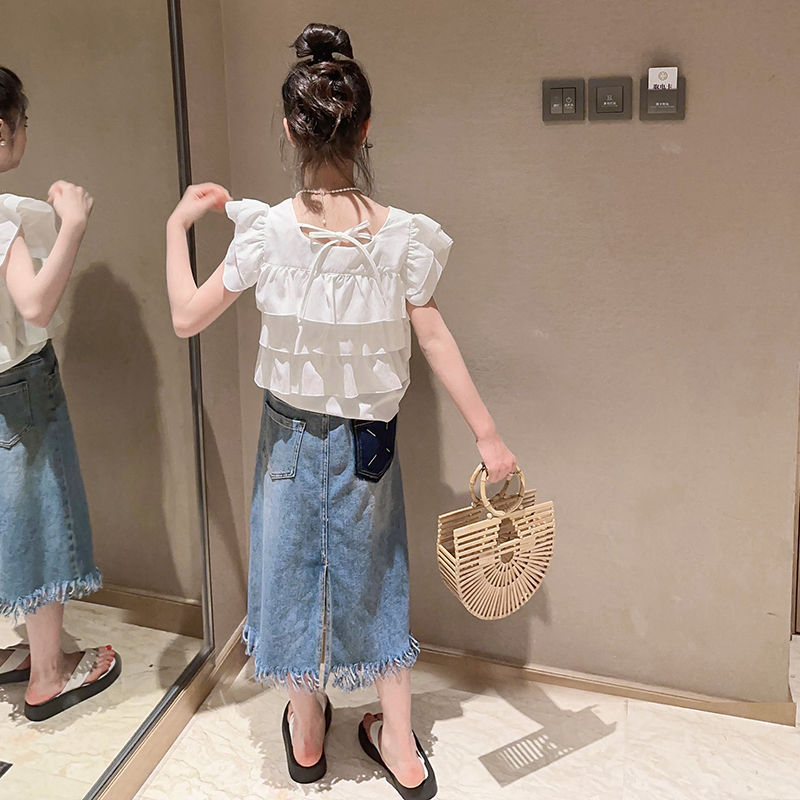 | nameOriginal | Girls' Denim Skirt Summer Suit 2024 New Children's Small Flying Sleeve Top Fashionable Hip Skirt Stylish Two-Piece Set |