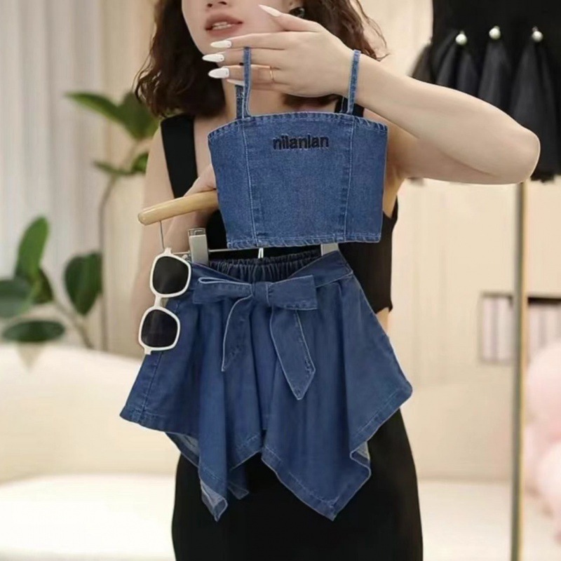 | nameOriginal | Girls' Denim Strap suit 2024 Summer New Fashionable Children's Stylish Irregular Culottes Denim suit Two-piece Set |