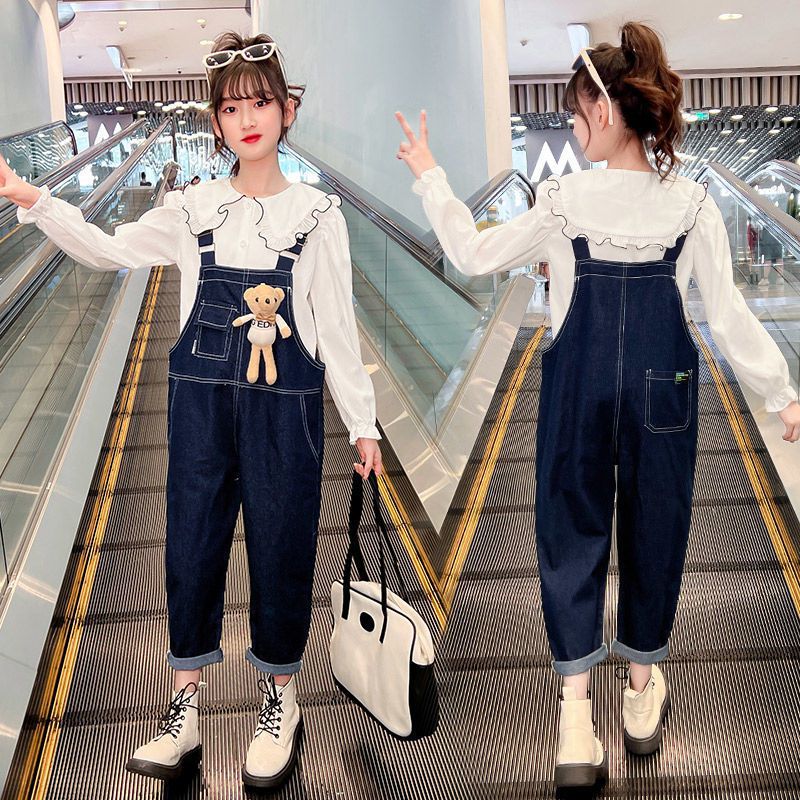 Girls' Denim Suspender Pants suit Spring and Autumn 2024 New Korean-style Girl Sling Two-piece Set